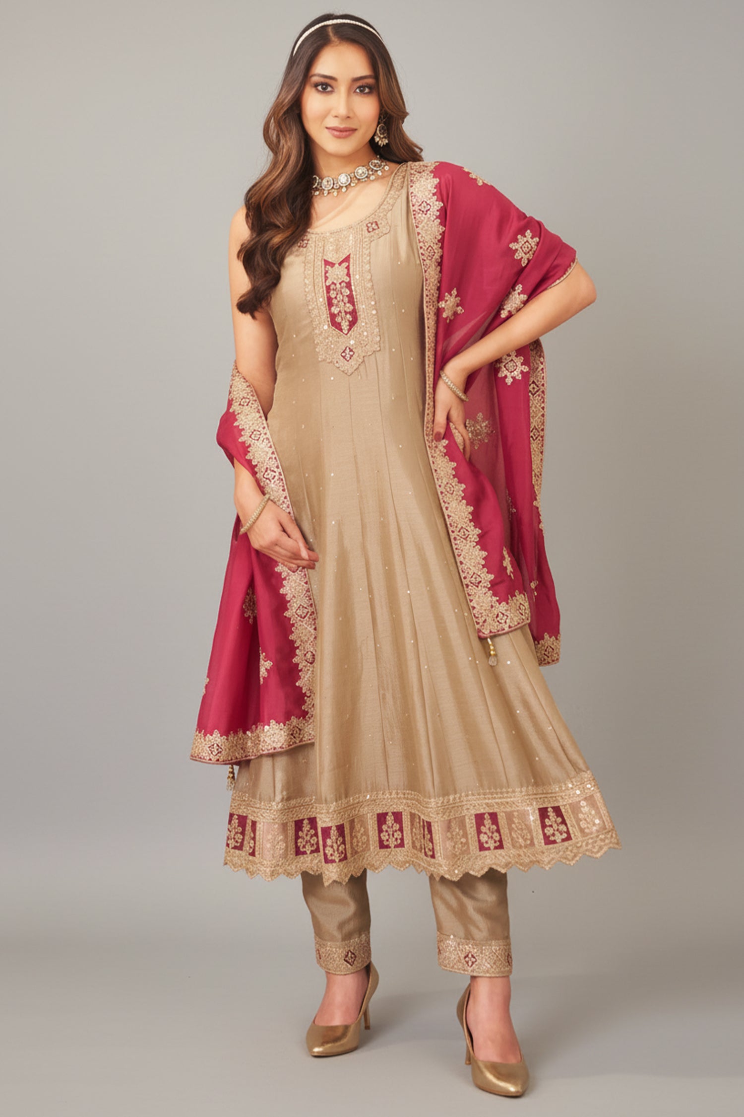 This elegant Anarkali suit is crafted from luxurious beige art silk, offering a soft sheen and refined drape. The bodice and flare are highlighted with delicate sequin embroidery that adds subtle festive sparkle. Finished with a coordinated dupatta, this ensemble is perfect for weddings, receptions, and traditional celebrations. Complete with an unstitched blouse piece, this ensemble exudes unmatched luxury and refined elegance.