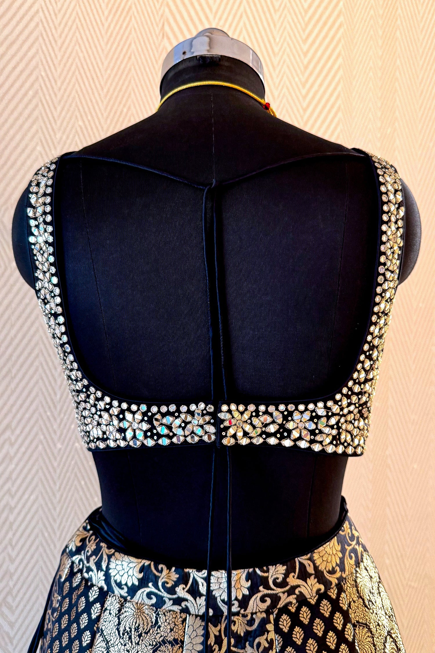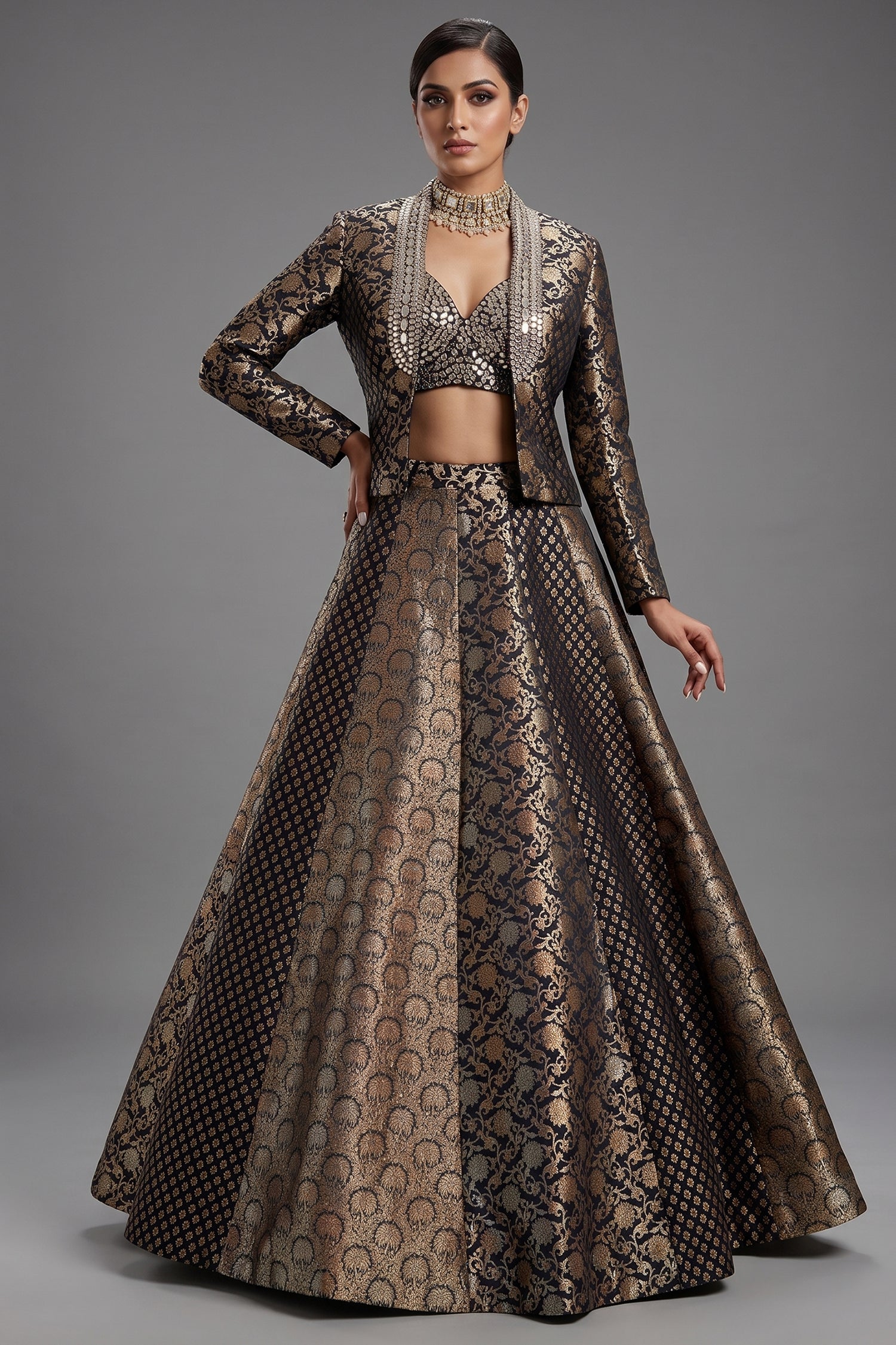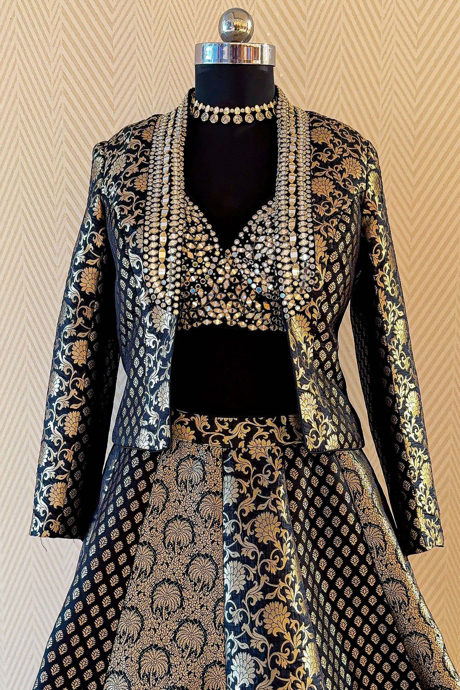 Black and Golden Banarasi Brocade Silk Crop Top Lehenga with Jacket