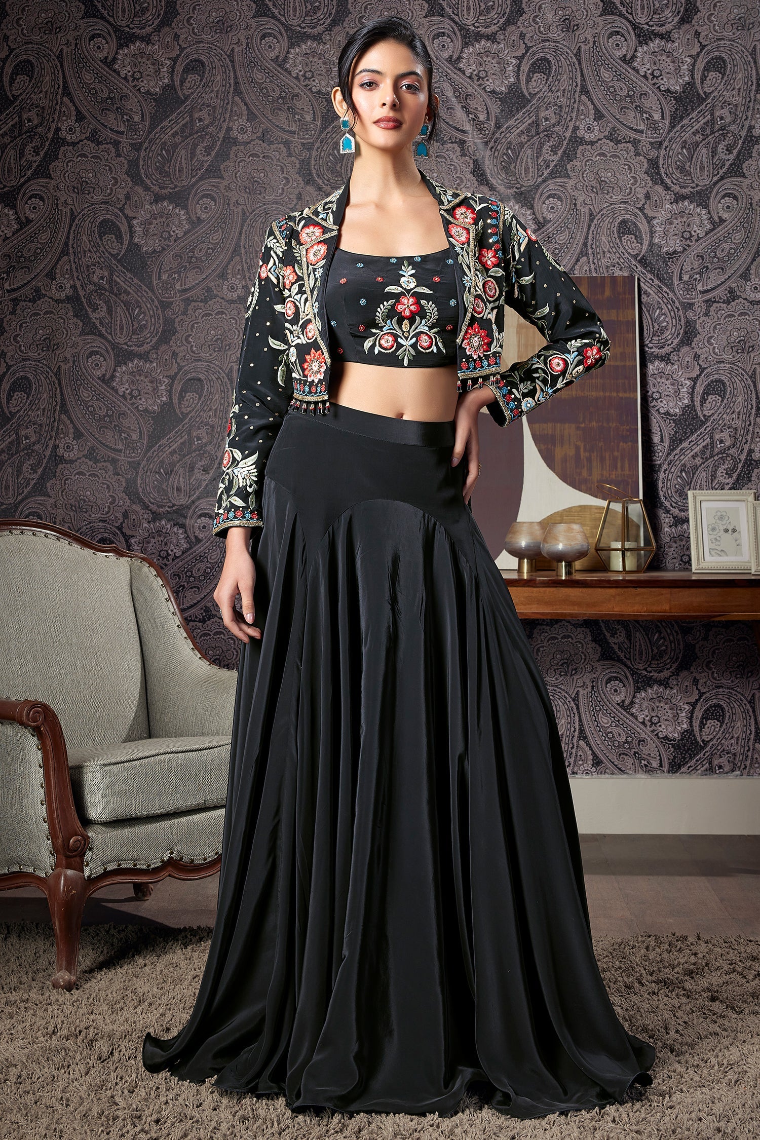 Black Crepe Silk Floral Embroidered Crop Top with Mermaid Cut Lehenga and Jacket
