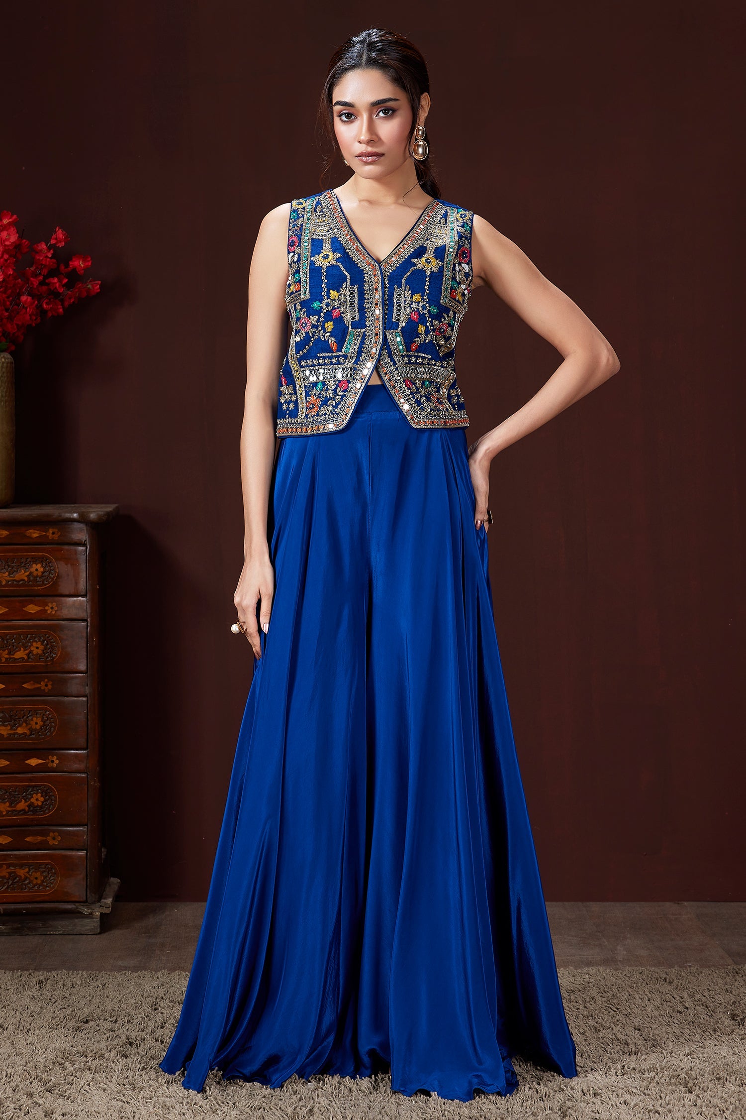 This royal blue silk ensemble, featuring a masterfully tailored crop top drenched in vibrant mirror work and intricate embroidery. The bodice is an artisanal masterpiece, showcasing multi-colored threadwork and shimmering artisanal details that pop against the deep blue base. Paired with fluid, high-waisted palazzo pants, the silhouette offers a sleek and breezy movement perfect for a high-fashion festive look. This design strikes a flawless balance between traditional craft and modern tailoring, ensuring a polished and unforgettable presence.