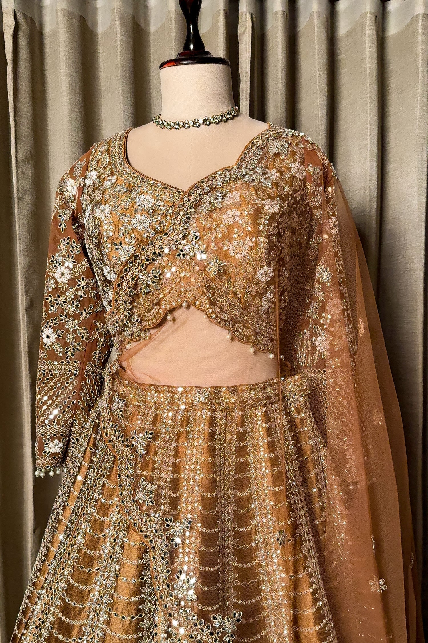 Radiate royal vibes in this exquisite Brown Silk Lehenga. The ensemble is a masterpiece of craftsmanship, featuring intricate embroidery, shimmering sequins, and detailed cutdana work that creates a mesmerizing striped and scalloped pattern. The blouse is heavily embellished with floral motifs and features a unique scalloped hemline with delicate pearl droplets. Paired with a matching net dupatta adorned with scattered sequin buttis, this stitched lehenga is the perfect choice for a grand reception or a glamorous wedding night.