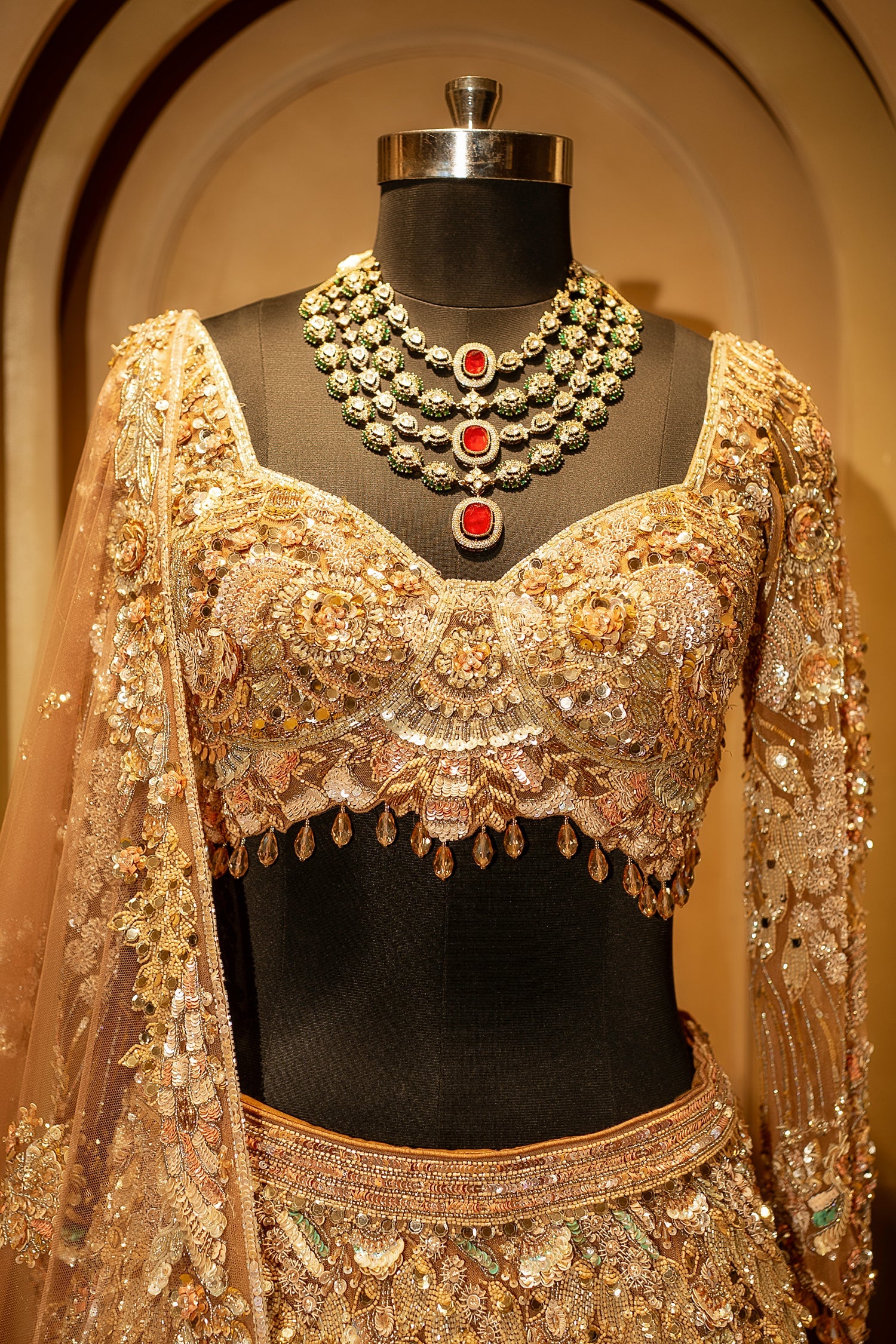 Opt for a heavy Polki or Kundan choker set with emerald or ruby accents to provide a regal contrast against the gold tones. Stacked bangles and a statement Maang Tikka will complete the majestic bridal look.A soft matte base paired with champagne shimmer eyes and a bold crimson or deep rose lip. Highlighting the cheekbones with a warm gold sheen will complement the metallic embroidery.A sleek low bun adorned with fresh white jasmine or a delicate gold hair accessory. This keeps the focus on the intricate neckline and the heavy jewelry.