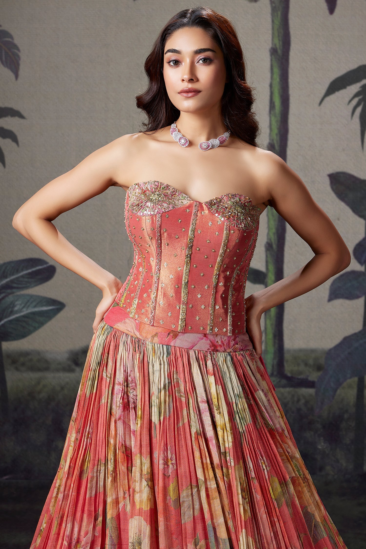 Radiate whimsical charm with this coral peach ensemble, where vibrant botanical motifs flow across a fluid georgette base, creating a dreamy, garden-inspired appeal. The silhouette is elevated by a high-fashion off-shoulder corset blouse, richly adorned with intricate handwork and shimmering embellishments for a sculpted, luxurious finish. A voluminous flared lehenga enhances movement while maintaining an effortless elegance. Perfect for sun-drenched destination weddings and statement festive occasions, it feels both fresh and refined. This design beautifully blends modern couture structure with the soft, ethereal grace of traditional prints. A striking expression of trend-forward style paired with artisanal craftsmanship.