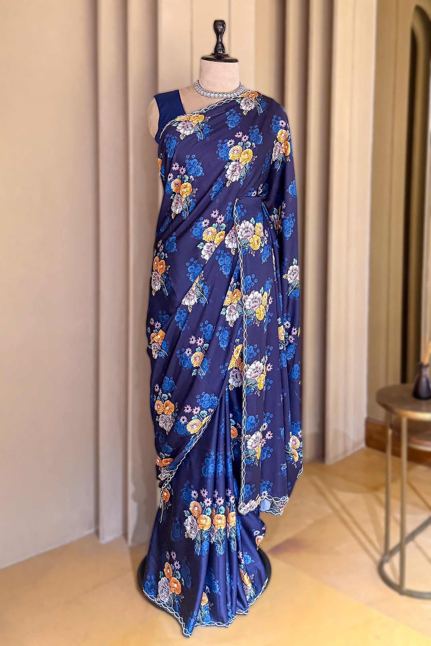 Command the spotlight in this Dark Blue Crepe Silk Saree, a masterclass in modern luxury and traditional craftsmanship. The deep midnight-blue canvas is adorned with a high-definition digital floral print, featuring vibrant sun-yellow and cornflower-blue blossoms that appear to bloom across the fabric. Elevating the artistry, each floral motif is hand-highlighted with shimmering sequins and silver cutdana work, creating a sophisticated 3D sparkle. The saree is elegantly framed by a designer scalloped border, meticulously hand-beaded with white clusters and metallic accents. Crafted from premium crepe silk, this saree offers a fluid, wrinkle-resistant drape that skims the silhouette, making it the ultimate choice for a grand wedding reception or a high-octane sangeet ceremony.