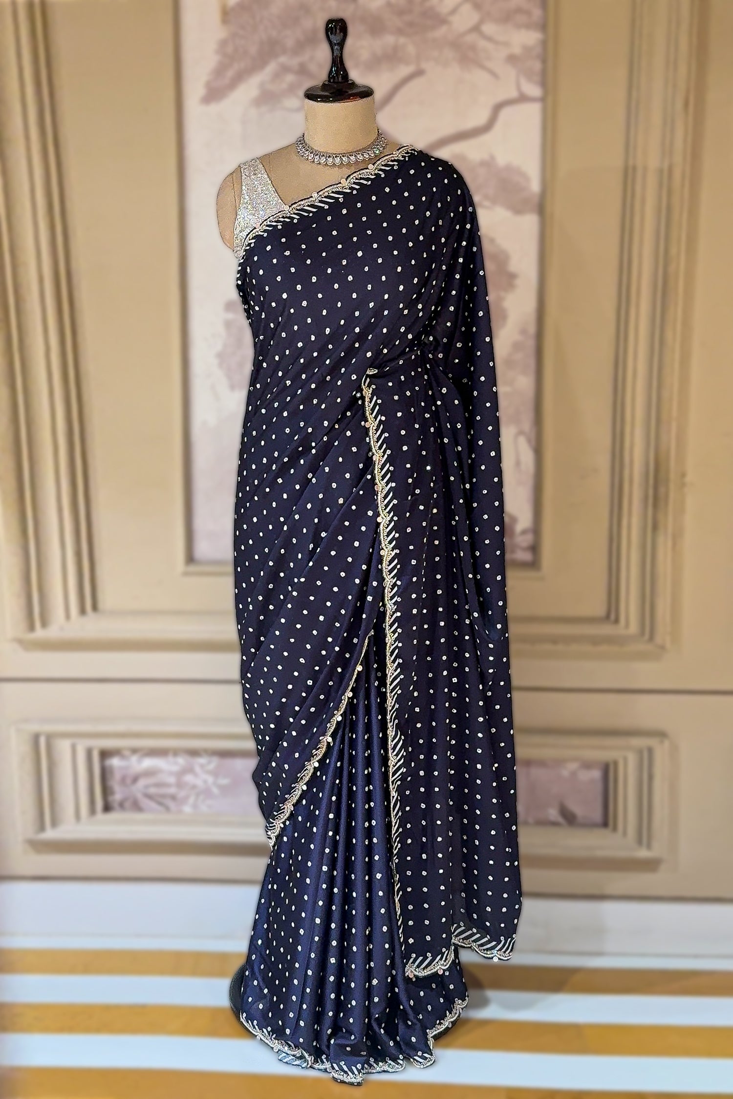 A: The saree comes with a matching Dark Blue unstitched crepe silk blouse piece. However, if you love the high-contrast silver look featured on the mannequin, our support team can help you customize a similar silver sequin blouse for an additional charge.