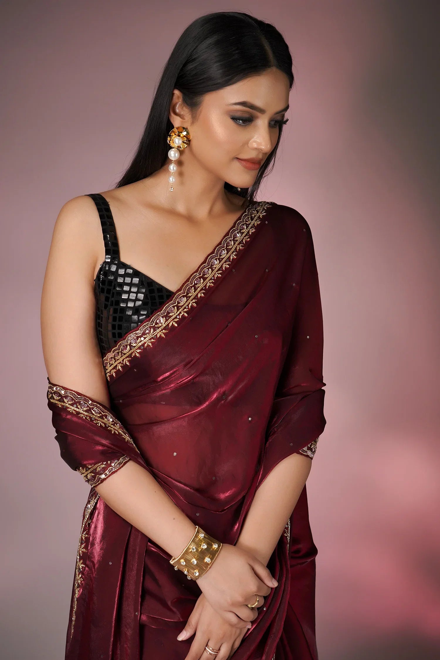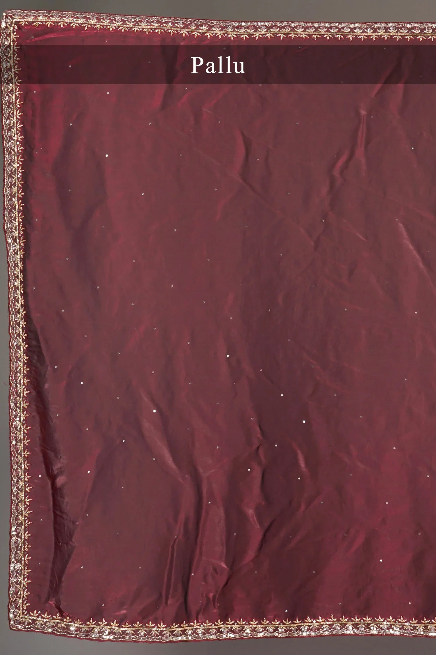 Indulge in regal elegance with our Dark Maroon Glass Tissue Saree, exquisitely handworked for a timeless look. Perfect for weddings, evening festivities, or any celebration where grandeur is key.