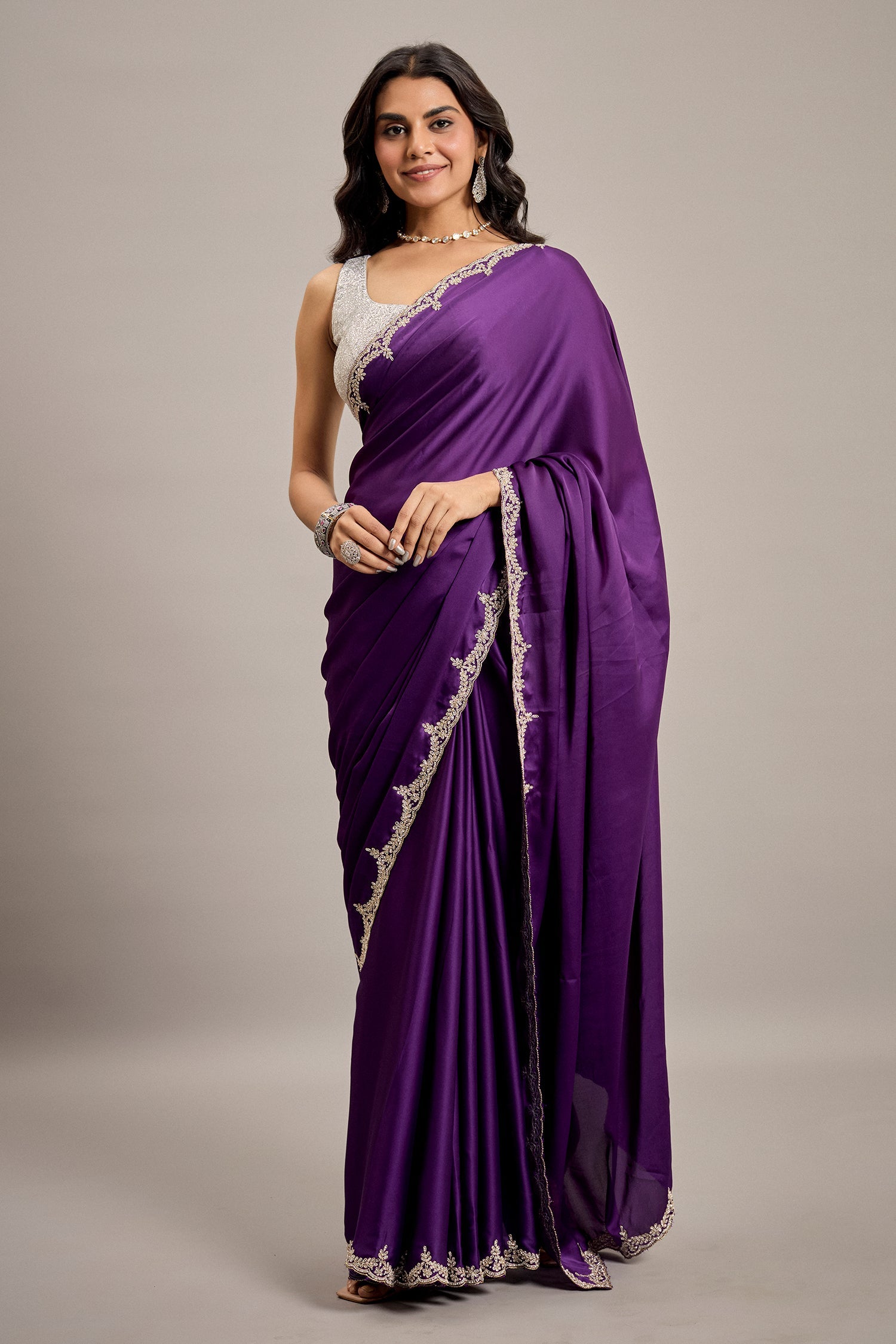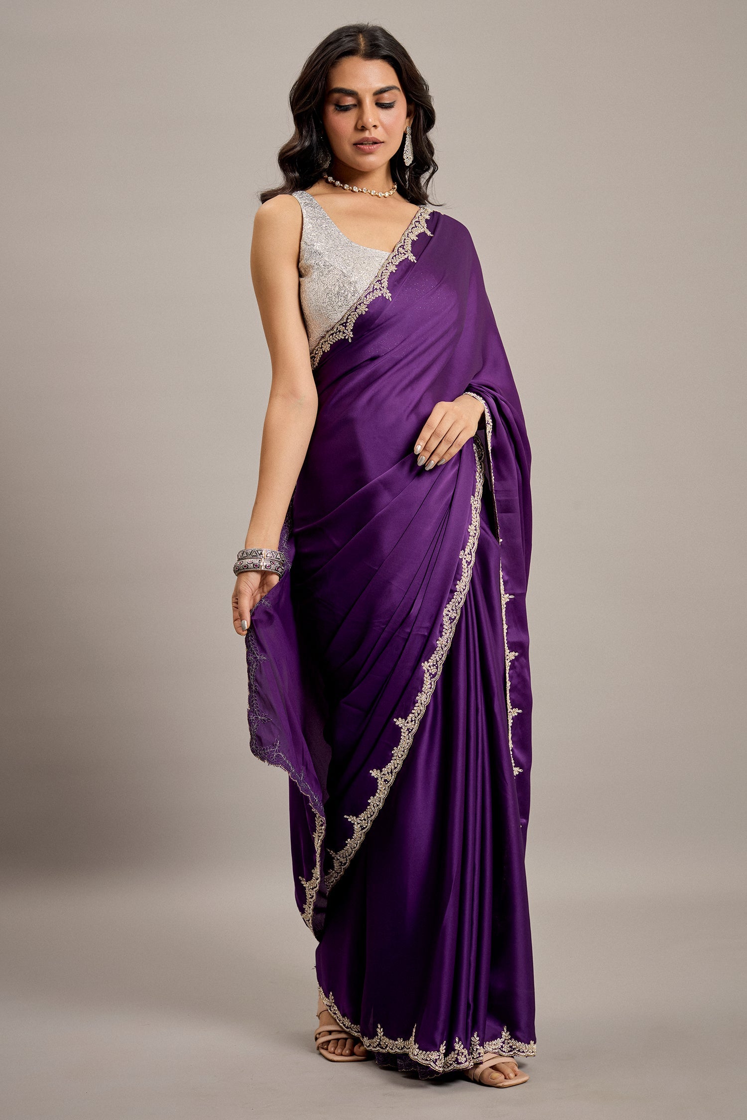 Step into refined elegance with our Deep Violet Satin Crepe Silk Saree, adorned with a subtle diamond-embellished border. An ideal pick for cocktail evenings, festive gatherings, or reception soirées that call for understated glamour.