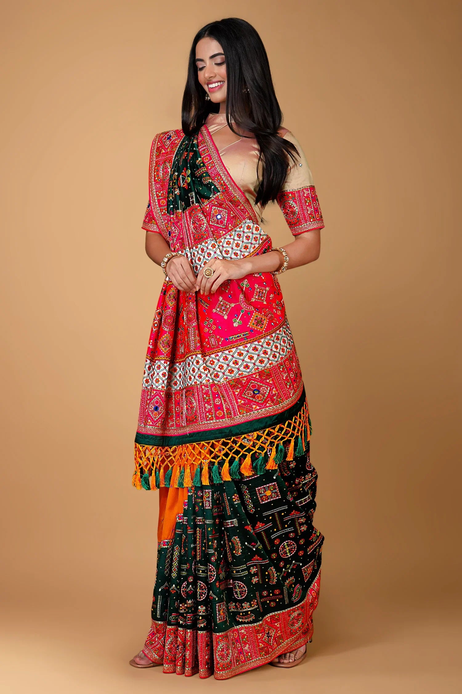 Embrace timeless sophistication with our Forest Green Silk Saree, beautifully enhanced by intricate embroidery and a contrasting border & pallu. Ideal for cultural occasions, wedding seasons, or festive evenings that celebrate refined craft.