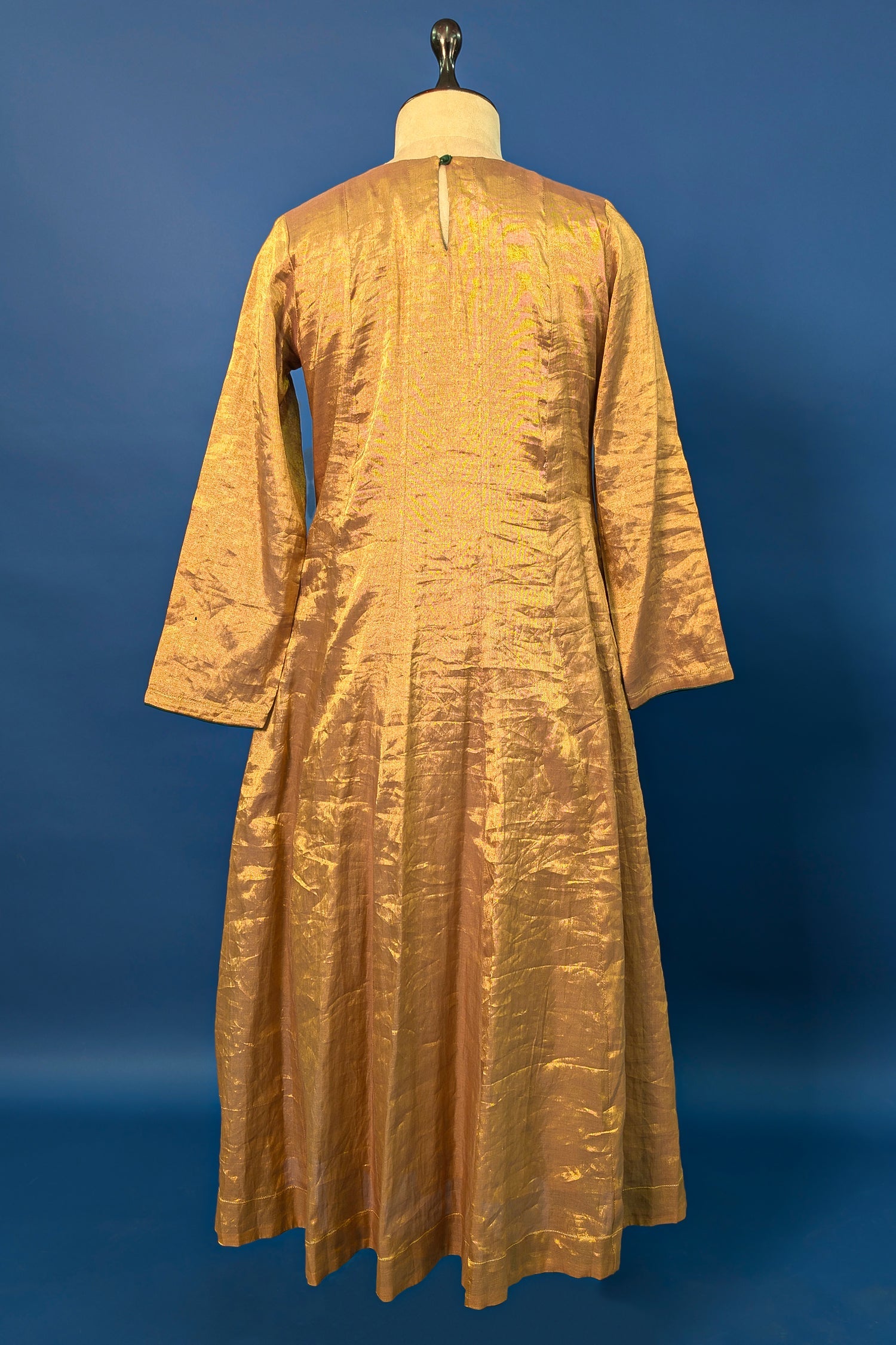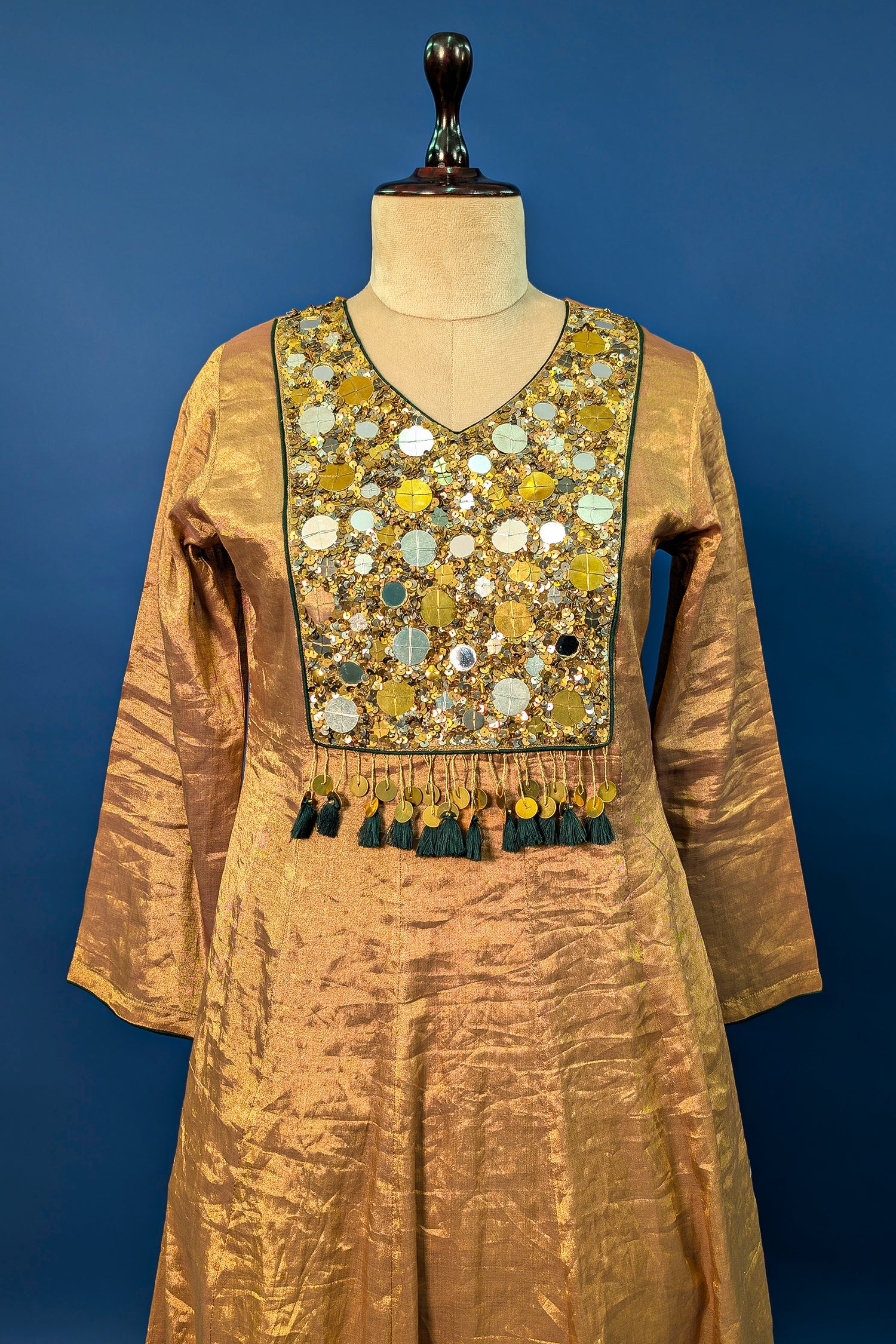 Radiate timeless charm in this Golden Tissue Silk Anarkali Suit, meticulously crafted to offer a luxurious and regal appeal. The flowing Anarkali kurta shimmers beautifully in a rich golden hue, highlighted by a V-neckline lavishly adorned with sequin and mirror-style applique work. Delicate tassel and coin detailing along the yoke adds a subtle bohemian touch, while the contrasting green and gold striped dupatta with scalloped borders completes the ensemble with striking elegance. Perfect for weddings, festive celebrations, and grand evening occasions.