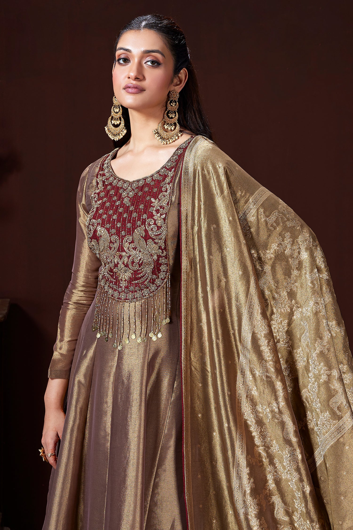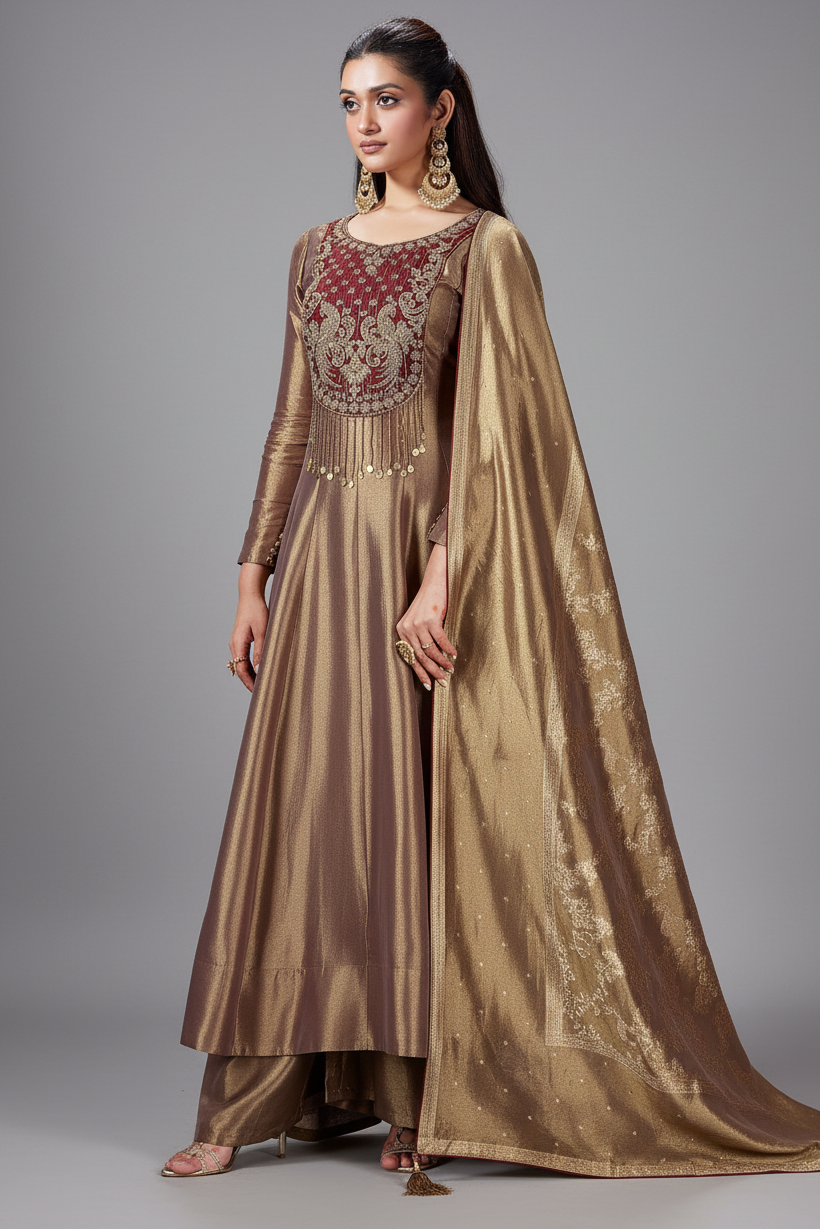 Sparkle with high-octane glamour in this golden tissue silk Anarkali Palazzo suit, designed to radiate regal elegance. The Anarkali features a luminous metallic sheen, enhanced by lavish cutdana and Zardosi work adorning the bodice and flowing gracefully into a refined long-line flare. Paired with coordinated palazzo pants and a matching shimmering tissue dupatta, the ensemble offers effortless movement while maintaining a structured, polished silhouette. A perfect harmony of traditional craftsmanship and contemporary sophistication, this outfit is ideal for grand celebrations and statement occasions.