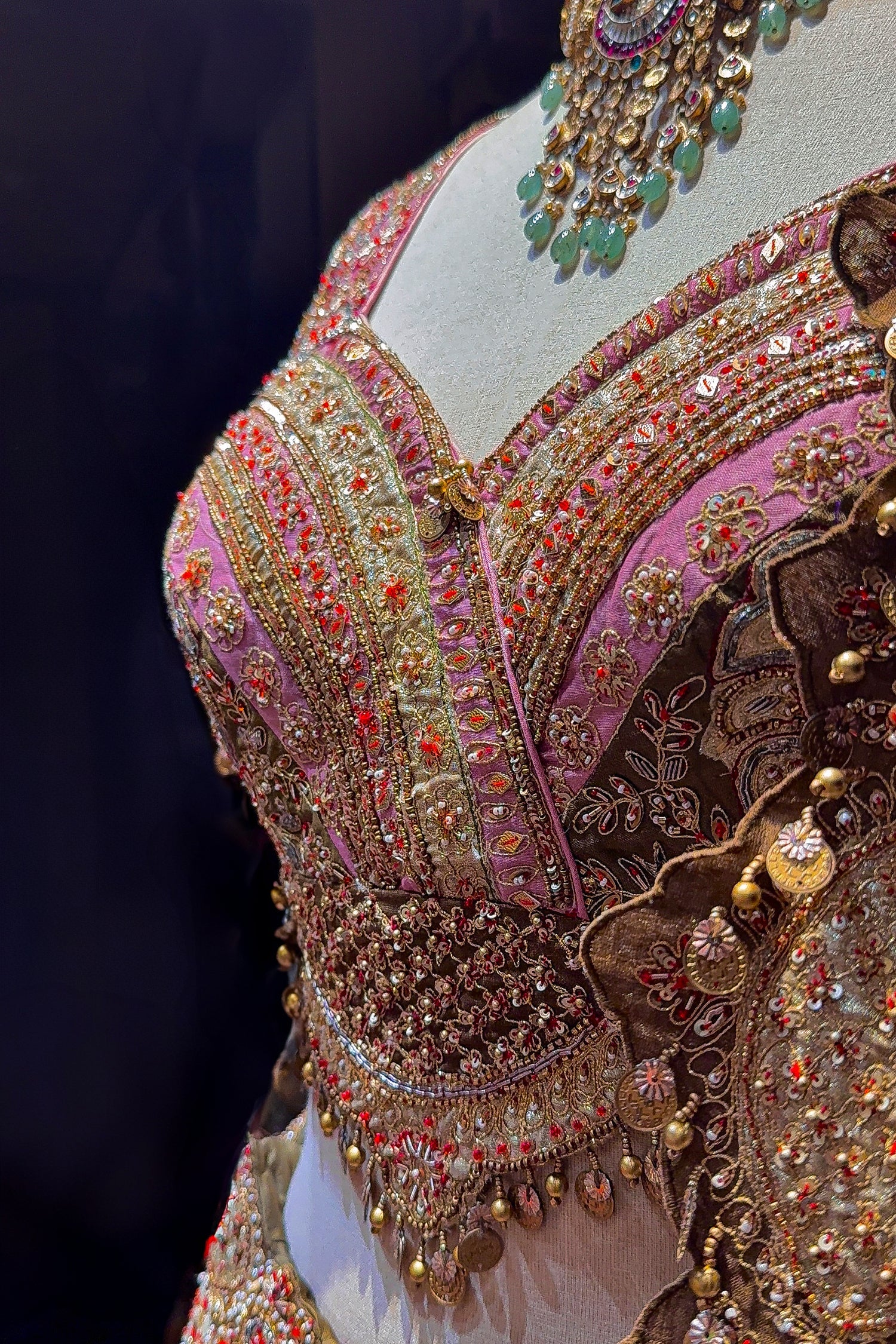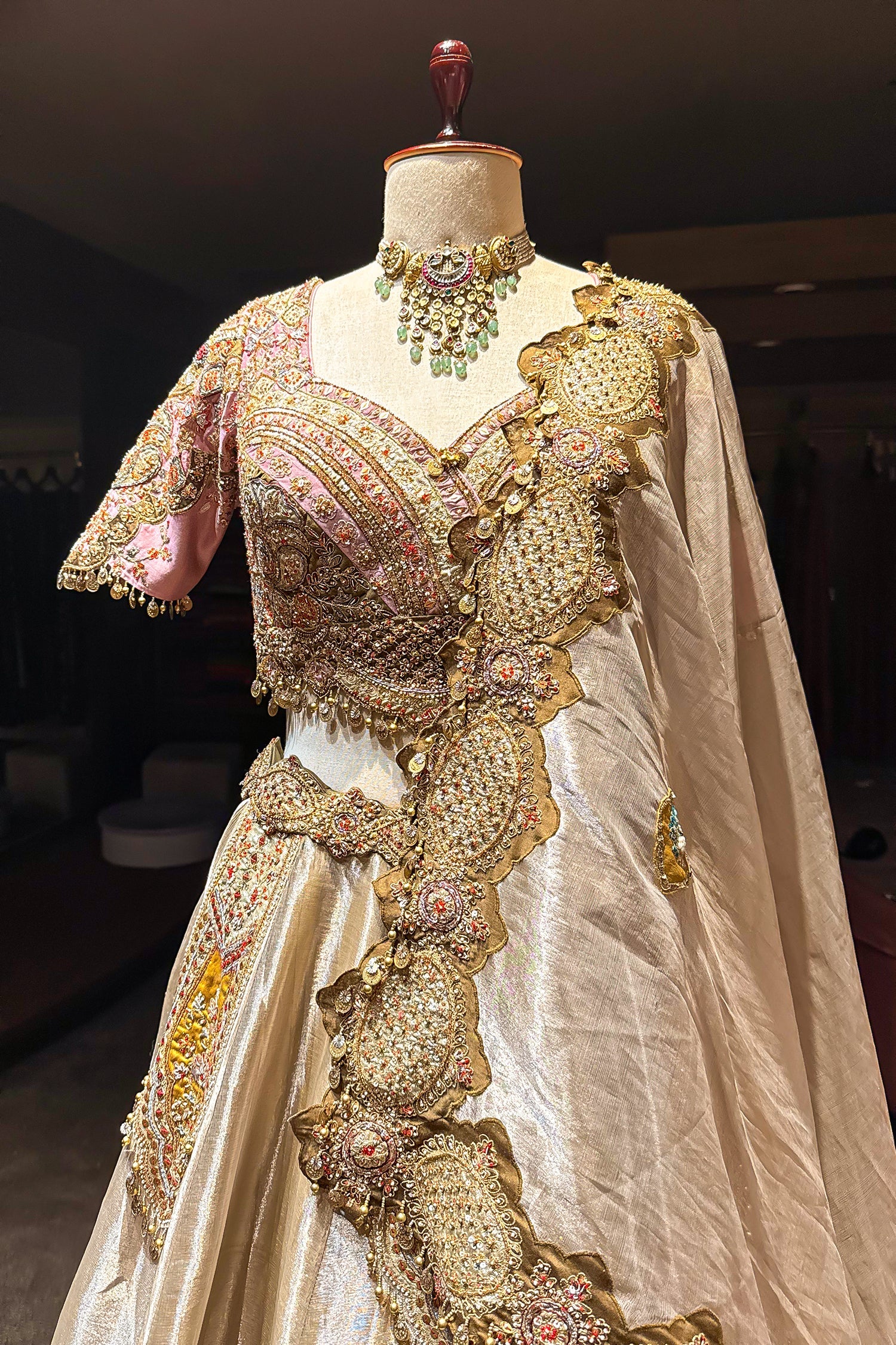 Experience regal elegance in this Golden Tissue Silk Designer Lehenga, adorned with intricate embroidery and rich zardosi patchwork.The beautifully crafted blouse features detailed handwork and a flattering structured silhouette.A matching dupatta with heavy scalloped borders adds a graceful, luxurious finish.Perfect for weddings and grand celebrations, this ensemble exudes timeless charm and sophistication.