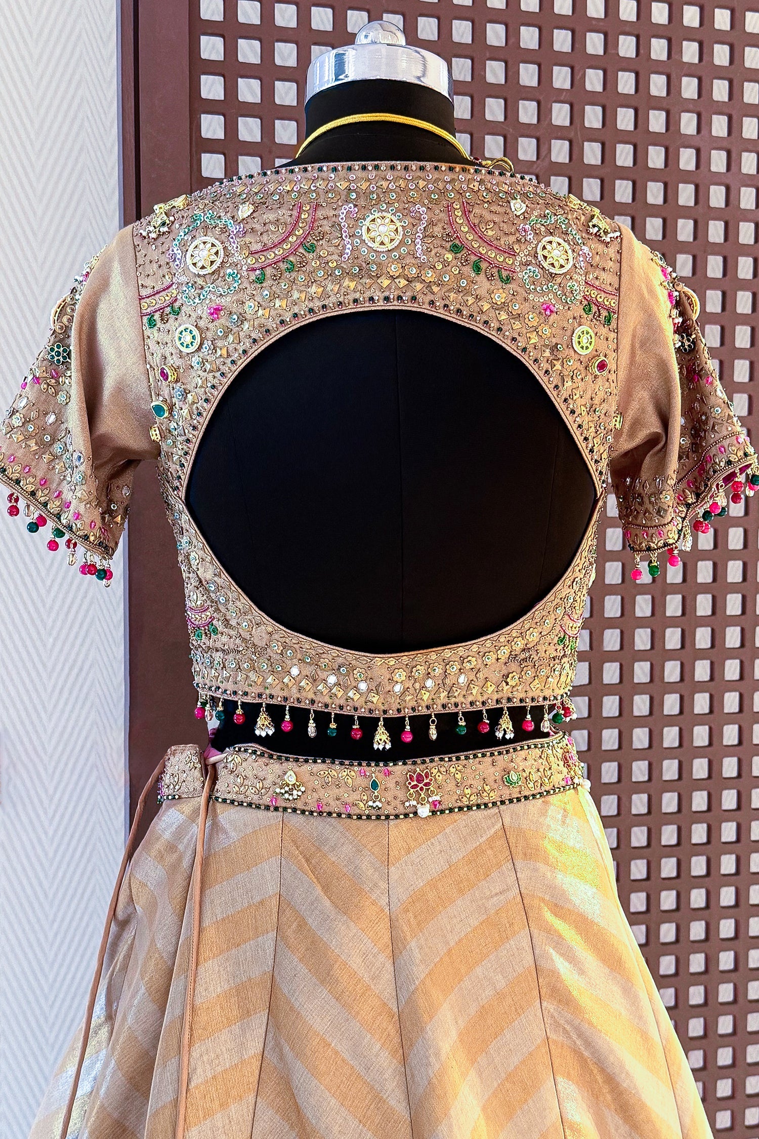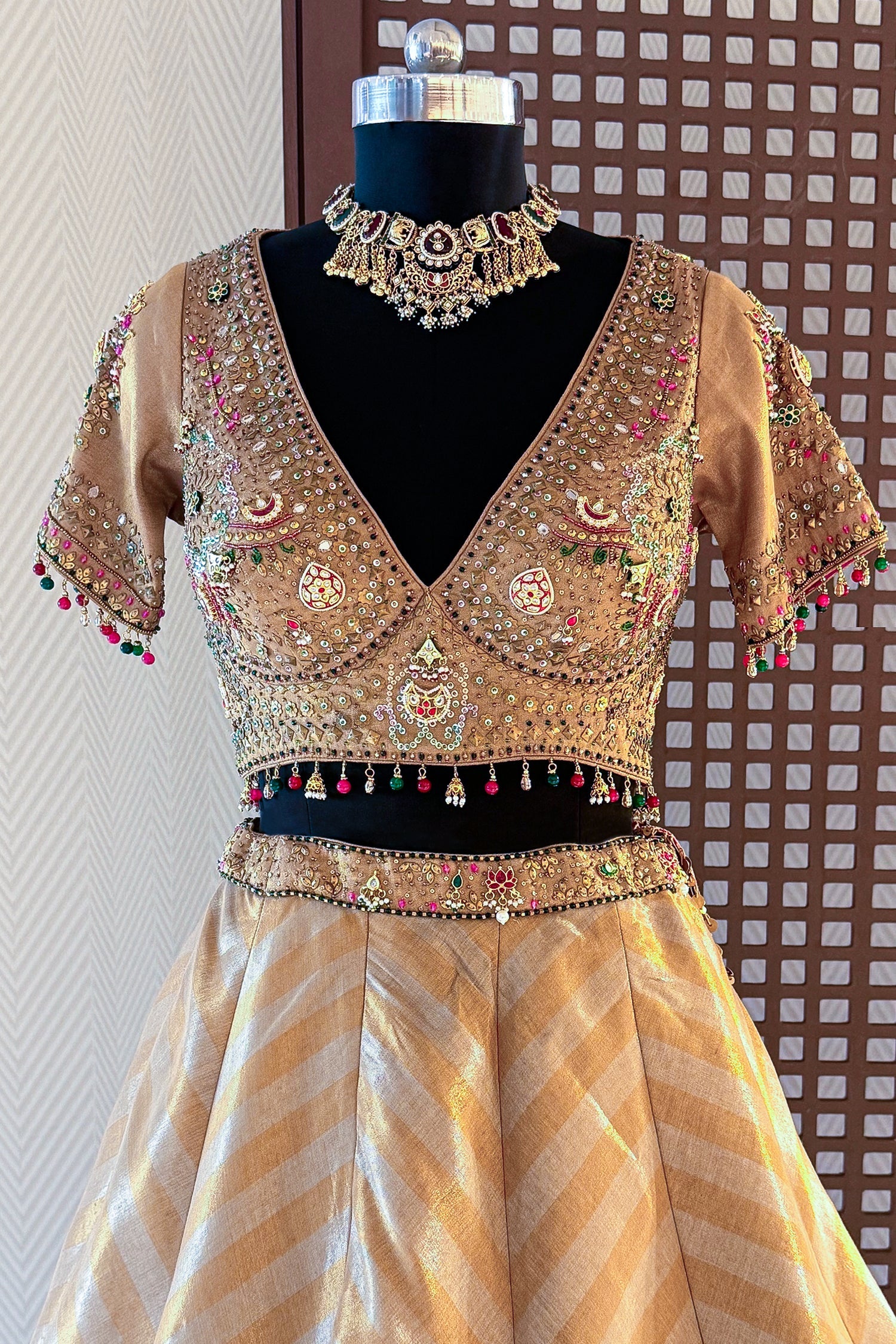 This stunning ensemble features a voluminous lehenga skirt crafted from premium golden tissue silk, showcasing a modern chevron-patterned weave that creates a dynamic play of light. The highlight is the masterfully tailored blouse, adorned with intricate Kundan "Jew-style" work and a vibrant palette of emerald green, ruby red, and pristine white stones. The front is designed with a deep V-neckline to accentuate the collarbone, while the back features a bold, circular cutout for a sophisticated and contemporary look. Finished with delicate hanging bead latkans along the hem and sleeves, this outfit perfectly balances traditional craftsmanship with a high-fashion aesthetic. It is the ultimate choice for a luxury wedding guest or a festive evening celebration.