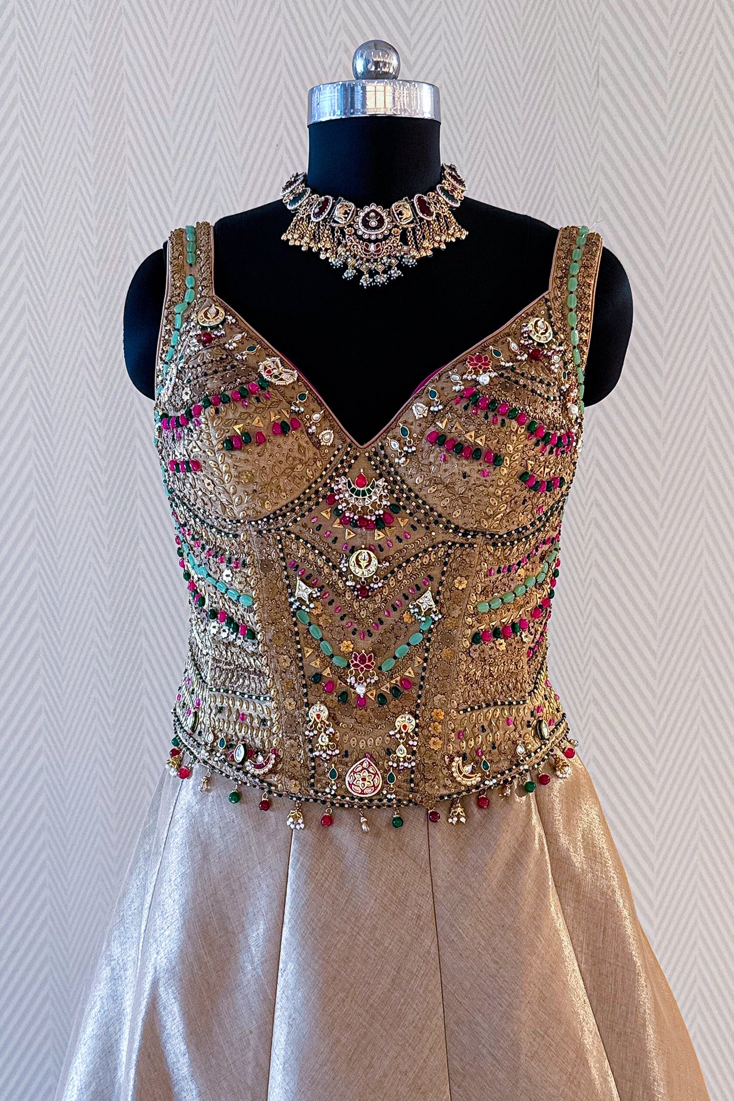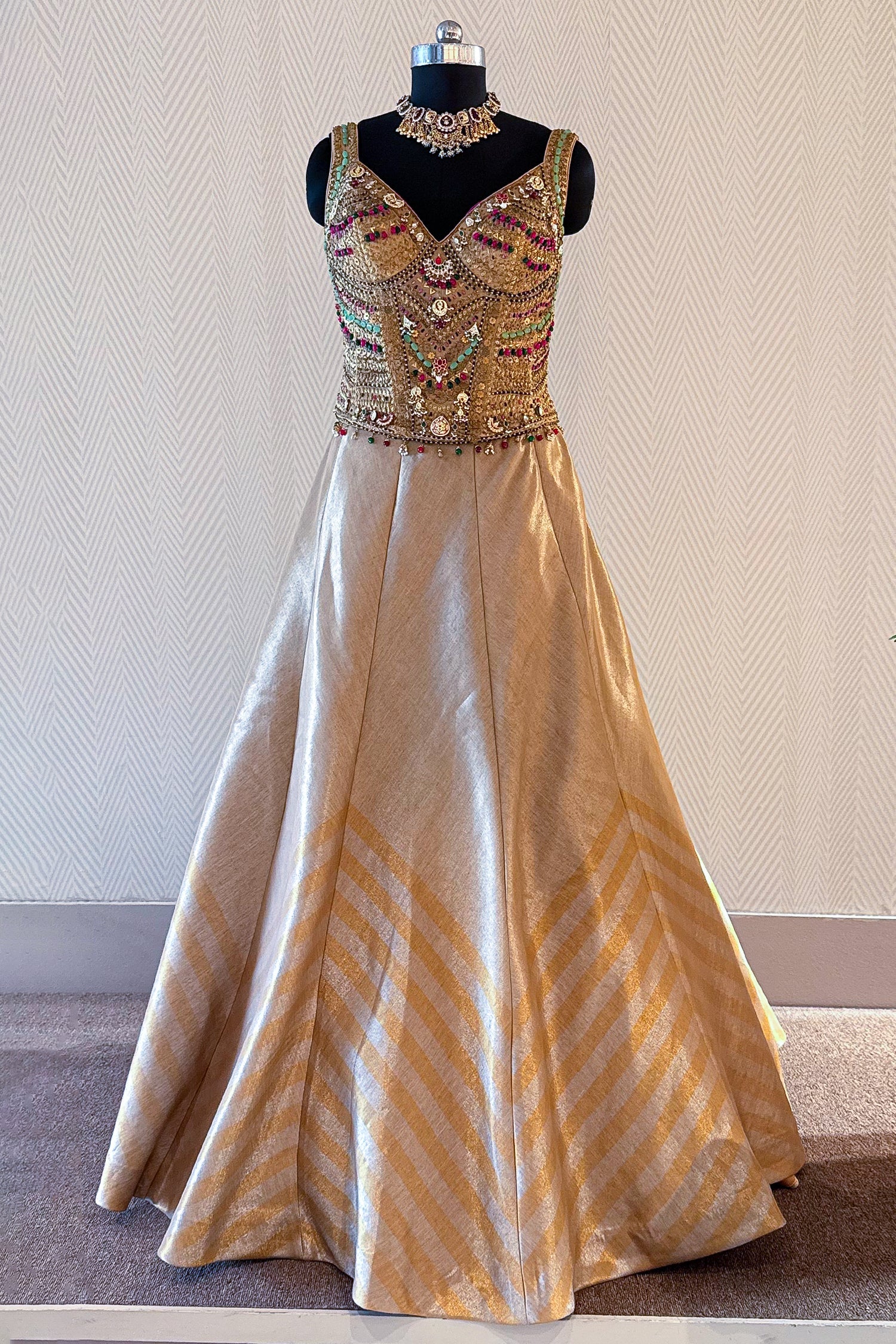 This Golden Tissue Silk Lehenga is paired with a striking corset-style blouse, meticulously detailed with heavy Kundan, beads, and stone work. The corset features a deep V-neckline and intricate hand-embroidery that flows into a jewelry-style pattern, highlighted by vibrant green and pink stone accents. Designed with a structured silhouette, the corset ensures a perfect fit while the hem is finished with delicate hanging beads for a regal touch. The flared lehenga skirt, crafted in premium tissue silk with diagonal metallic stripes, complements the heavy bodice for a balanced, high-fashion look. Ideal for grand weddings or receptions, this ensemble brings a contemporary twist to traditional Indian craftsmanship.