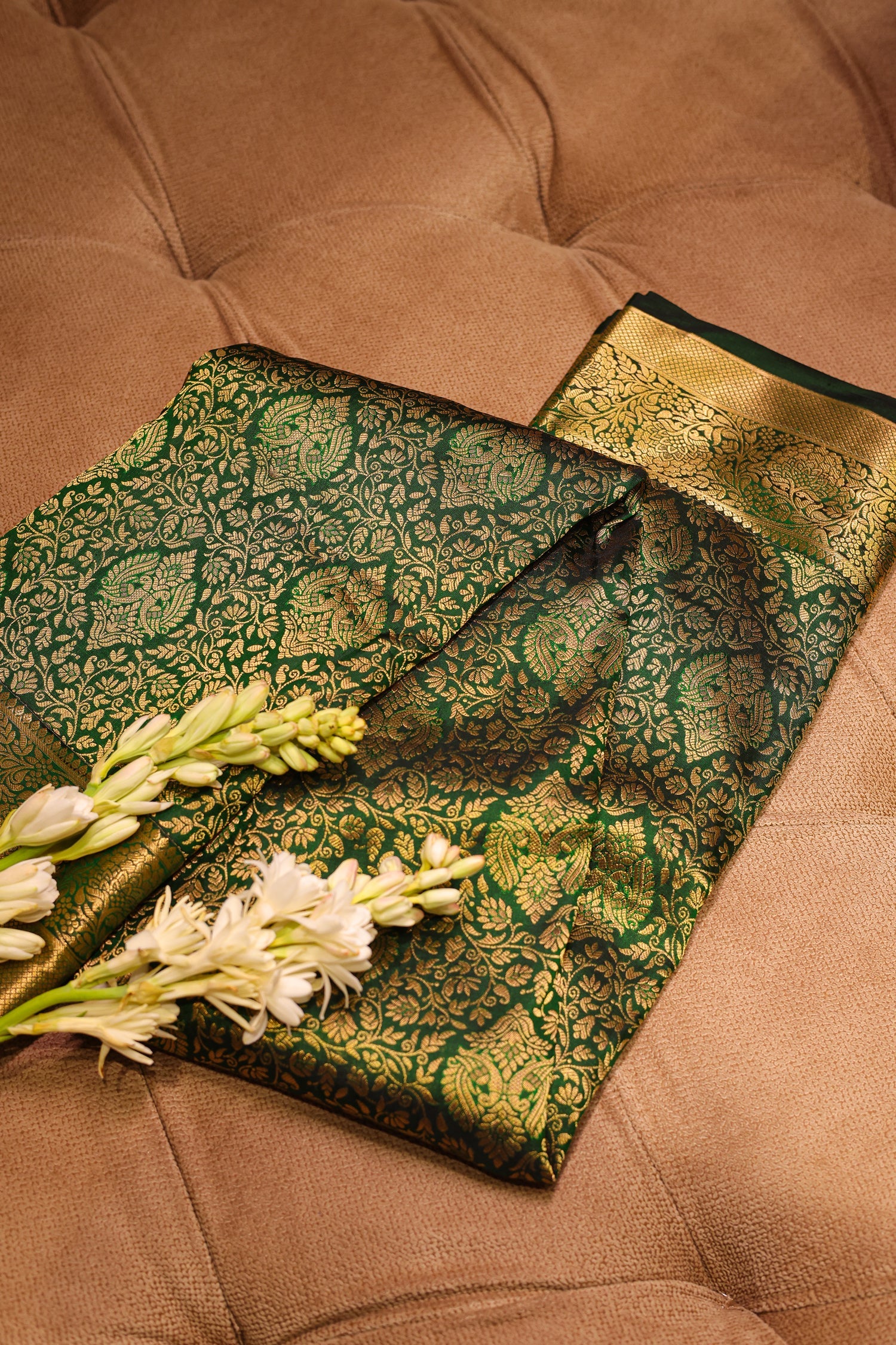 Radiate classic charm with this rich green Kanchipuram silk saree, intricately woven with traditional motifs that celebrate timeless South Indian artistry. The vibrant green shade paired with the lustrous silk fabric creates a regal aura, perfect for weddings, festive rituals, and grand cultural occasions. Its detailed weaving showcases impeccable craftsmanship, adding depth and heritage to every drape. A luxurious saree that beautifully blends tradition, sophistication, and enduring elegance.