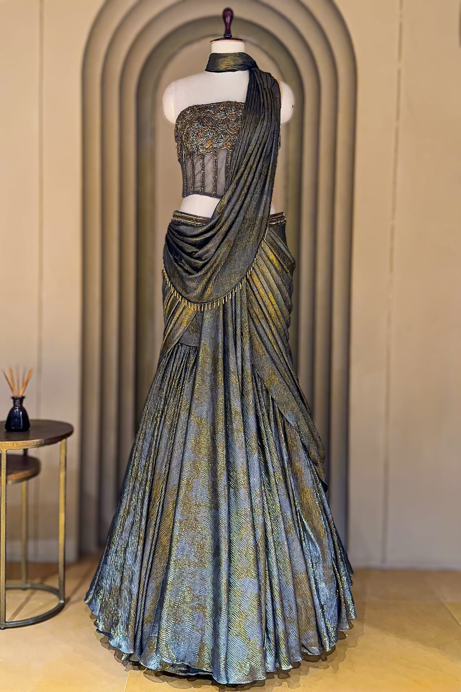 A statement of modern luxury, this grey georgette pre-draped lehenga–style saree blends contemporary draping with a rich metallic sheen. The fabric glides effortlessly, creating sculpted pleats that move with fluid grace, while the lehenga-style flare adds volume without weight — perfect for cocktail nights, receptions, or evening galas. The co-ordinated blouse is a true couture highlight, featuring intricate cutdana detailing in layered metallic tones. Textured embellishments, multi-hued shimmer, and a structured silhouette come together to create a bold yet refined look. The choker-style neckline and sheer paneling add an edge of high-fashion glamour, elevating the ensemble into a red-carpet-worthy piece.