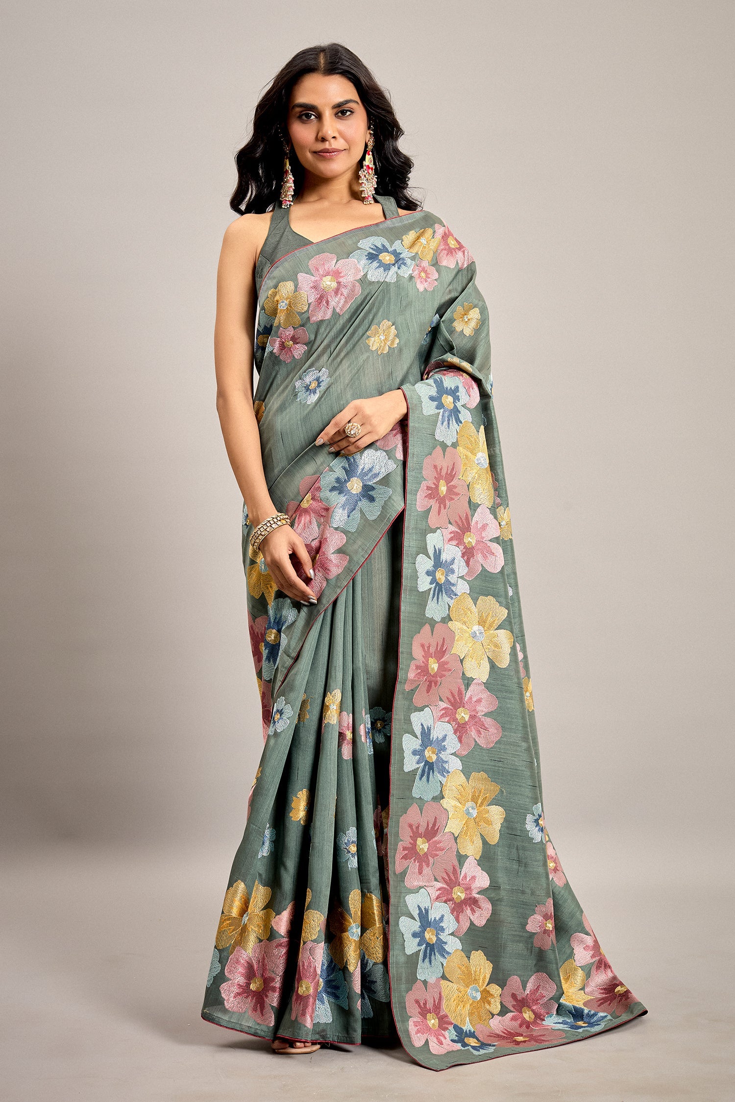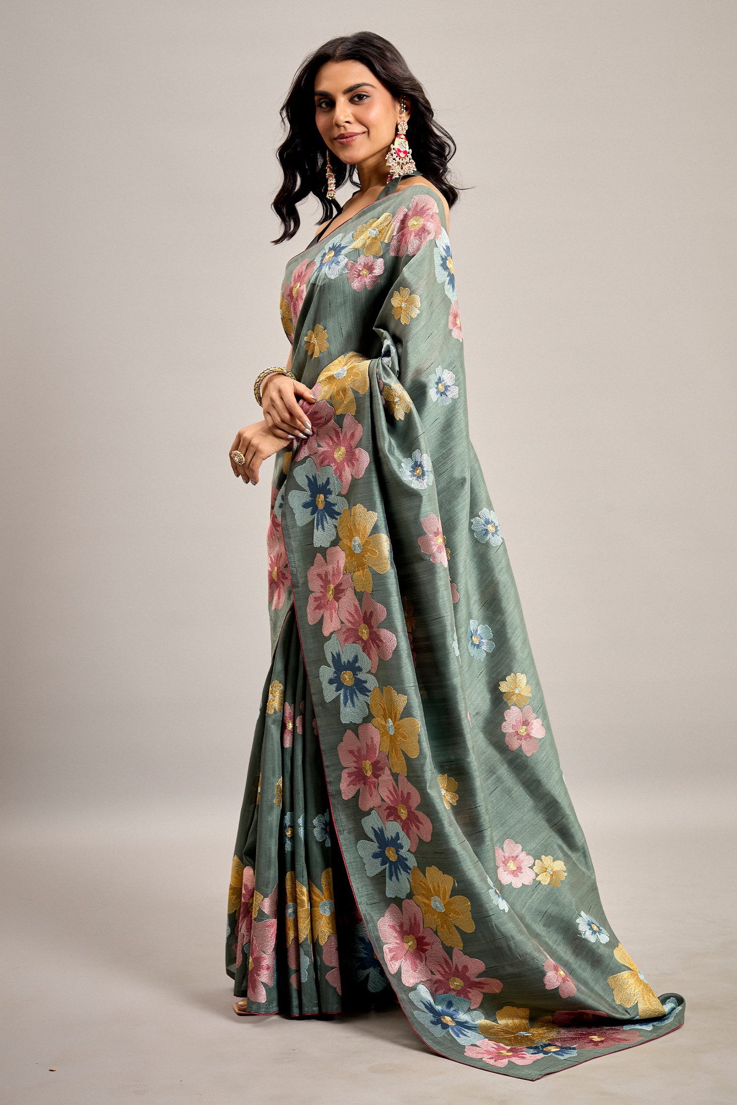 Woven in soft tussar-inspired art silk, this saree carries a muted grey tone that flatters all skin tones while ensuring a graceful, crisp silhouette.