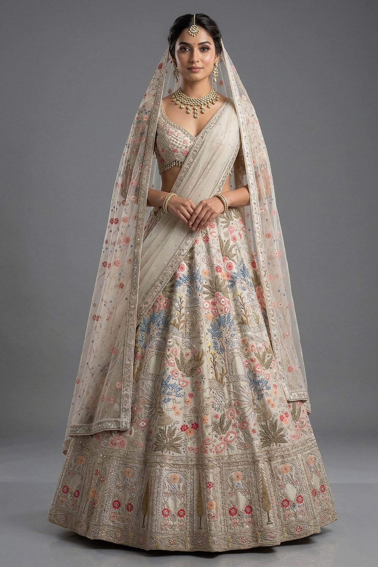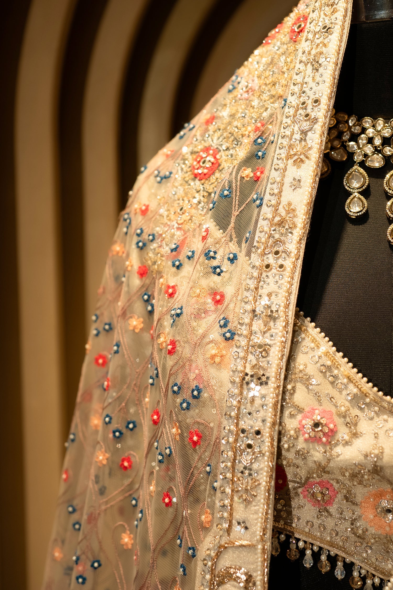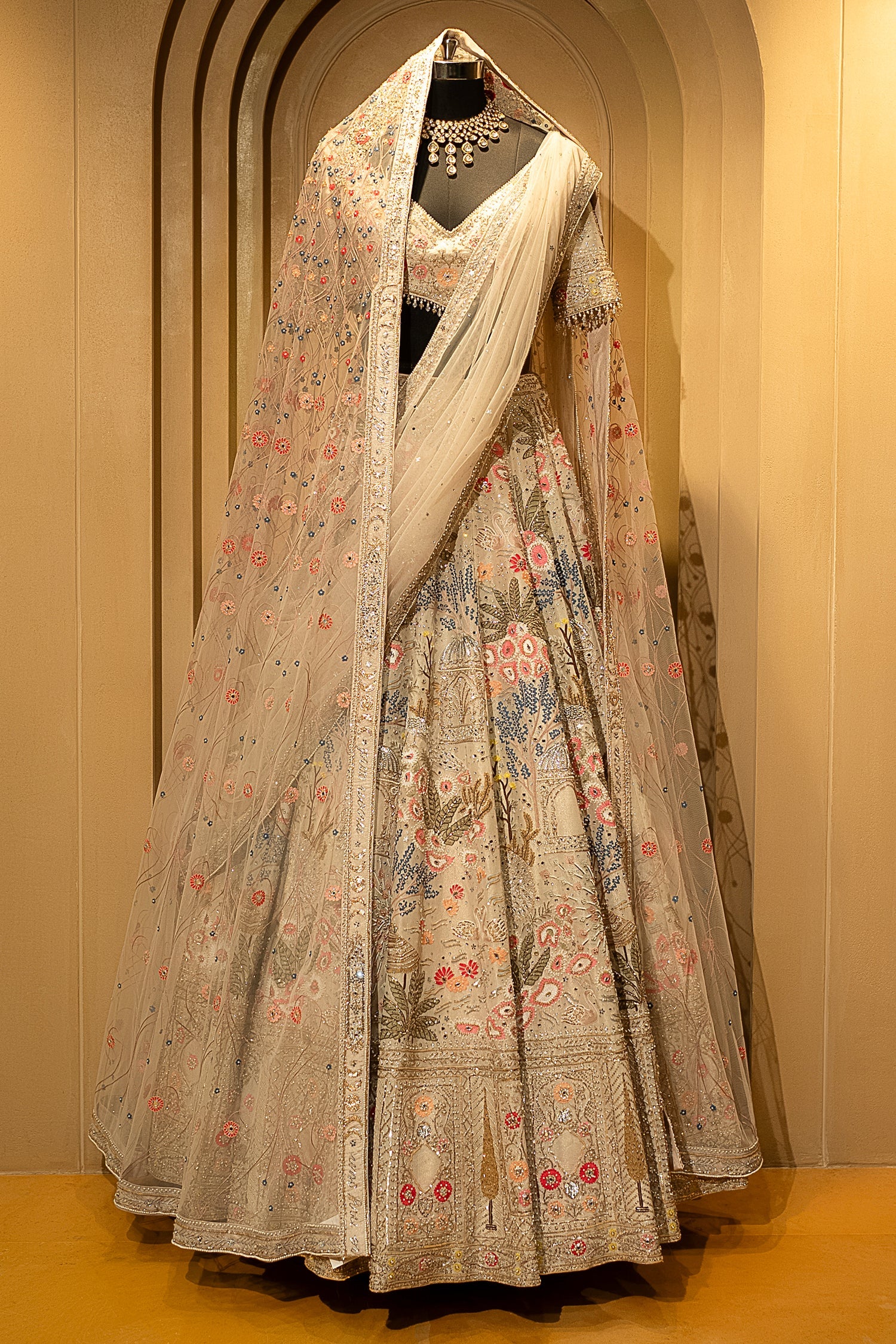 This Ivory Bridal Lehenga is an ethereal blend of traditional motifs and high-fashion aesthetics, meticulously crafted on a rich silk canvas. The ensemble features an elaborate "Jharokha" and "Garden" theme, where intricate embroidery meets the delicate shimmer of sequins and hand-placed beads. The skirt is a masterpiece of storytelling, showcasing graceful swan motifs and vibrant floral patterns that bring a sense of regal tranquility to the bridal look. Complementing the heavy lehenga is a beautifully embellished blouse and a dual-dupatta set—both in a crisp net —offering a sophisticated play of textures. Designed as a make-to-order piece, every stitch is dedicated to creating a bespoke silhouette for the modern bride.