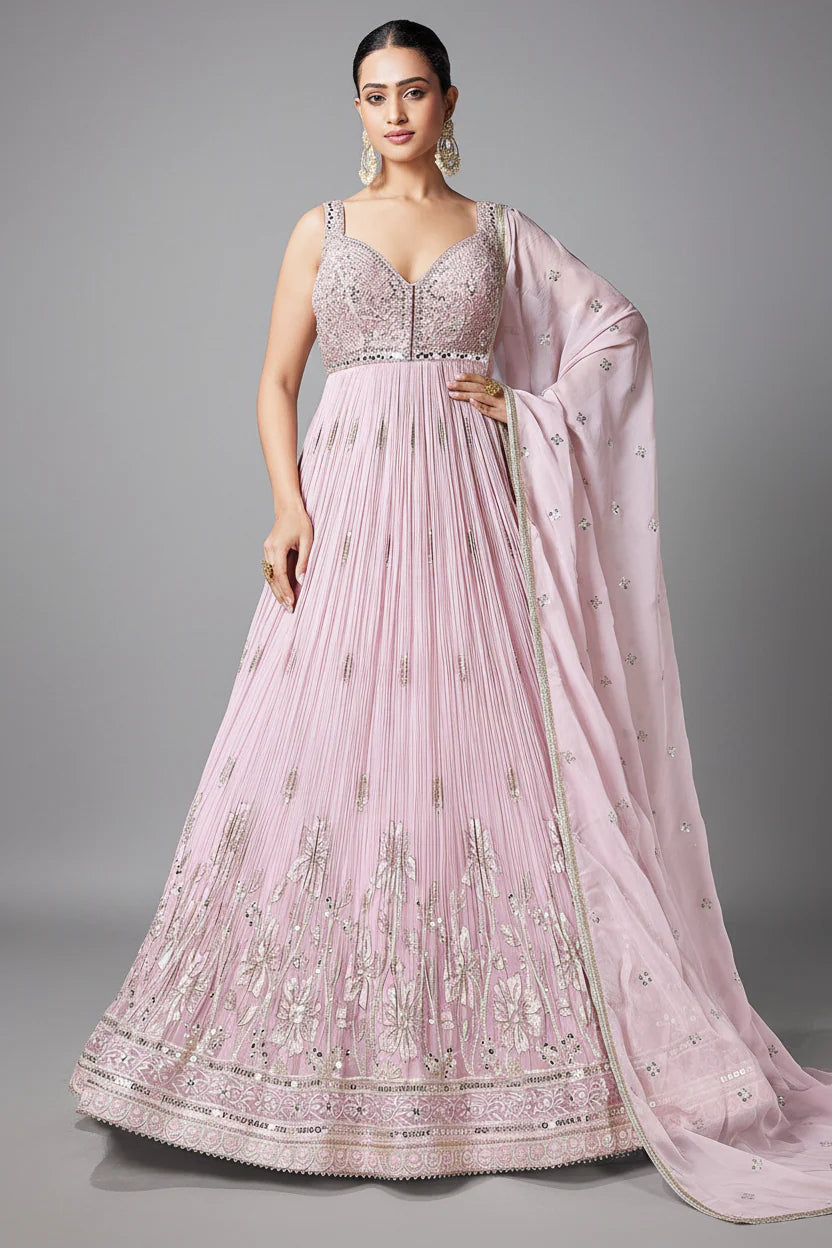 This enchanting light pink Georgette Anarkali suit is designed to capture timeless elegance with a modern romantic touch. The beautifully pleated flare is delicately accented with subtle mirror highlights and soft floral detailing, creating a graceful, flowy silhouette. The bodice stands out with intricate embroidery, shimmering mirror work, and refined thread artistry, complemented by elegant straps and a stylish deep tie-back design. A matching georgette dupatta adorned with scattered buttis and a neatly finished border completes the ensemble, while the floral-embroidered hemline adds a luxurious finish—perfect for weddings, receptions, and festive celebrations.