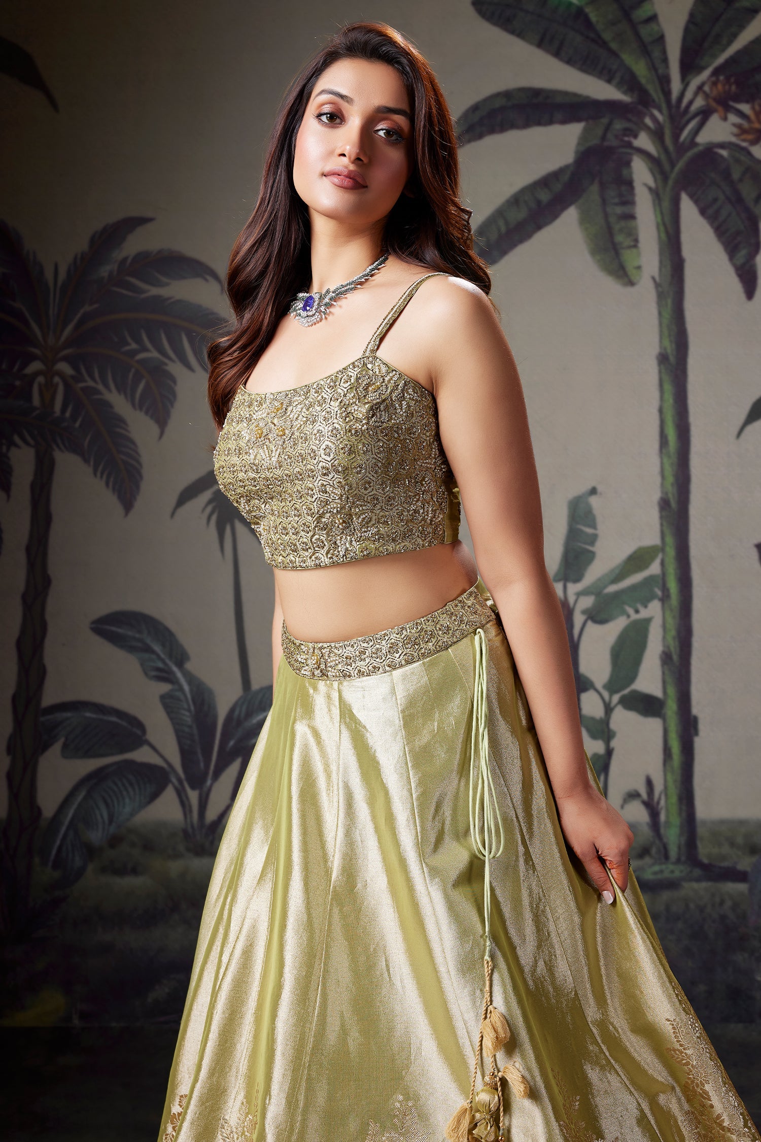 This soft pista-toned tissue lehenga is highlighted by delicate zari woven motifs, creating a luminous and refined texture across the flowing silhouette. The skirt carries a graceful fall with subtle woven detailing that adds depth without overpowering the look. It is paired with a hand-embellished blouse, adorned with fine bead and zardosi work that enhances the bodice with understated richness. A matching tissue dupatta with coordinated detailing completes the ensemble, making it an elegant choice for wedding celebrations and festive occasions.
