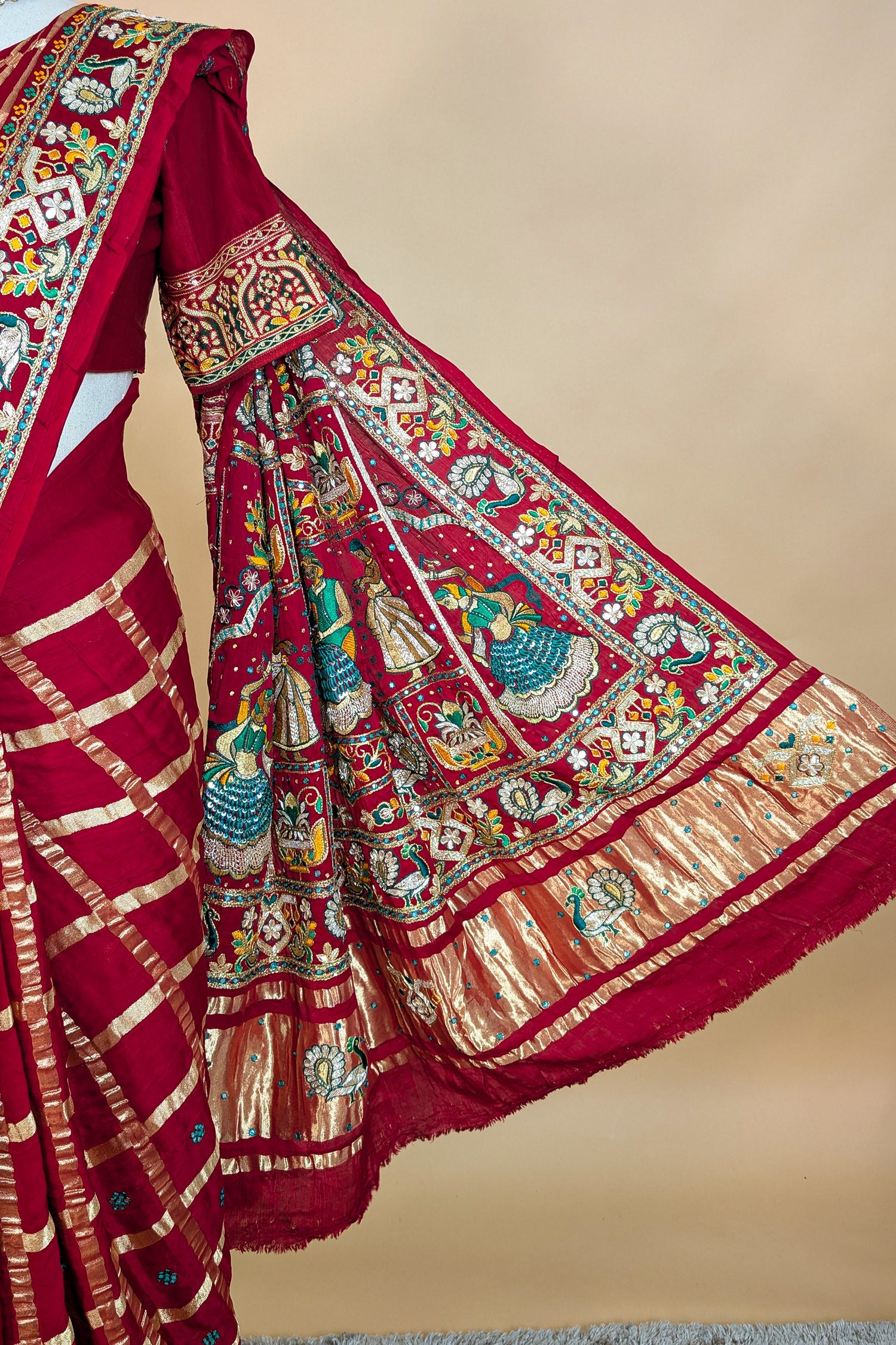 This exquisite maroon Gaji silk Gharchola saree features classic traditional checks highlighted beautifully across the body. The rich Gaji silk fabric enhances the drape with its natural sheen, while the saree’s timeless Gharchola pattern lends a regal touch. The pallu is adorned with heavy, intricate embroidery, adding depth, texture, and a luxurious finishing detail. The matching blouse worn in the picture is the same blouse piece provided with the saree.Complete with an unstitched blouse piece, this ensemble exudes unmatched luxury and refined elegance