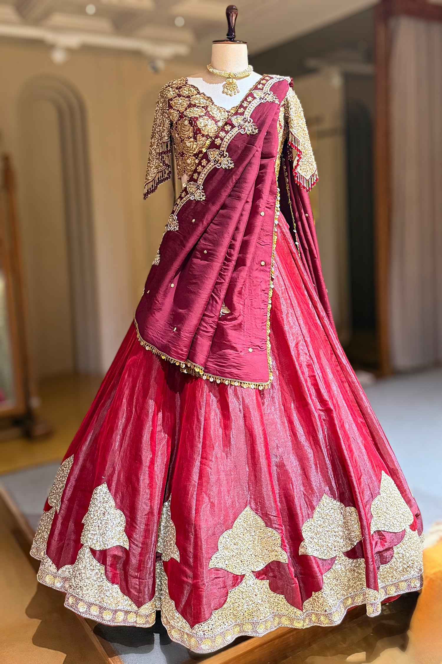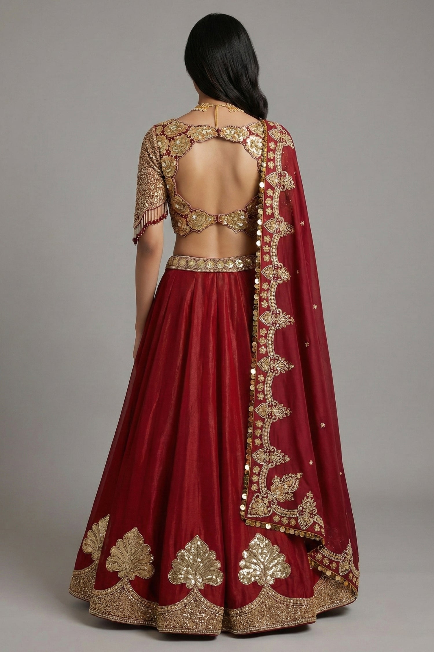 This maroon lehenga exudes pure luxury with its luminous glass-tissue organza flare, enriched by a bold, fully embellished scalloped border that glimmers with every step. The blouse features intricate 3D floral sequin embroidery paired with delicate beadwork, while the statement cut-out back adds a touch of contemporary glamour. The beautifully crafted dupatta, adorned with shimmering borders, ties the entire look together with regal sophistication. A masterpiece ideal for weddings, engagement soirées, and grand celebrations—designed to make you look effortlessly breathtaking.