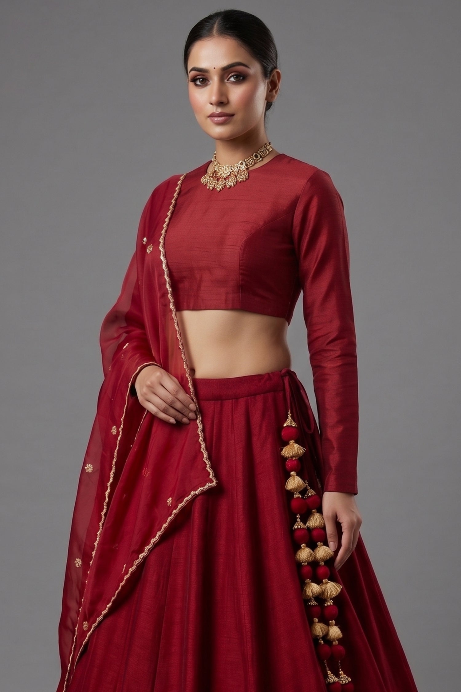 Complement the deep maroon silk with a bold traditional look, featuring a sharp gold-toned smokey eye and a classic deep red or berry lip.Opt for an antique gold or uncut diamond (Polki) bridal set with emerald or pearl drops to create a stunning contrast against the maroon base.A classic low floral bun or a sleek middle-parted gajra bun will elegantly showcase the blouse's neckline and the heavy embroidery of the dupatta.