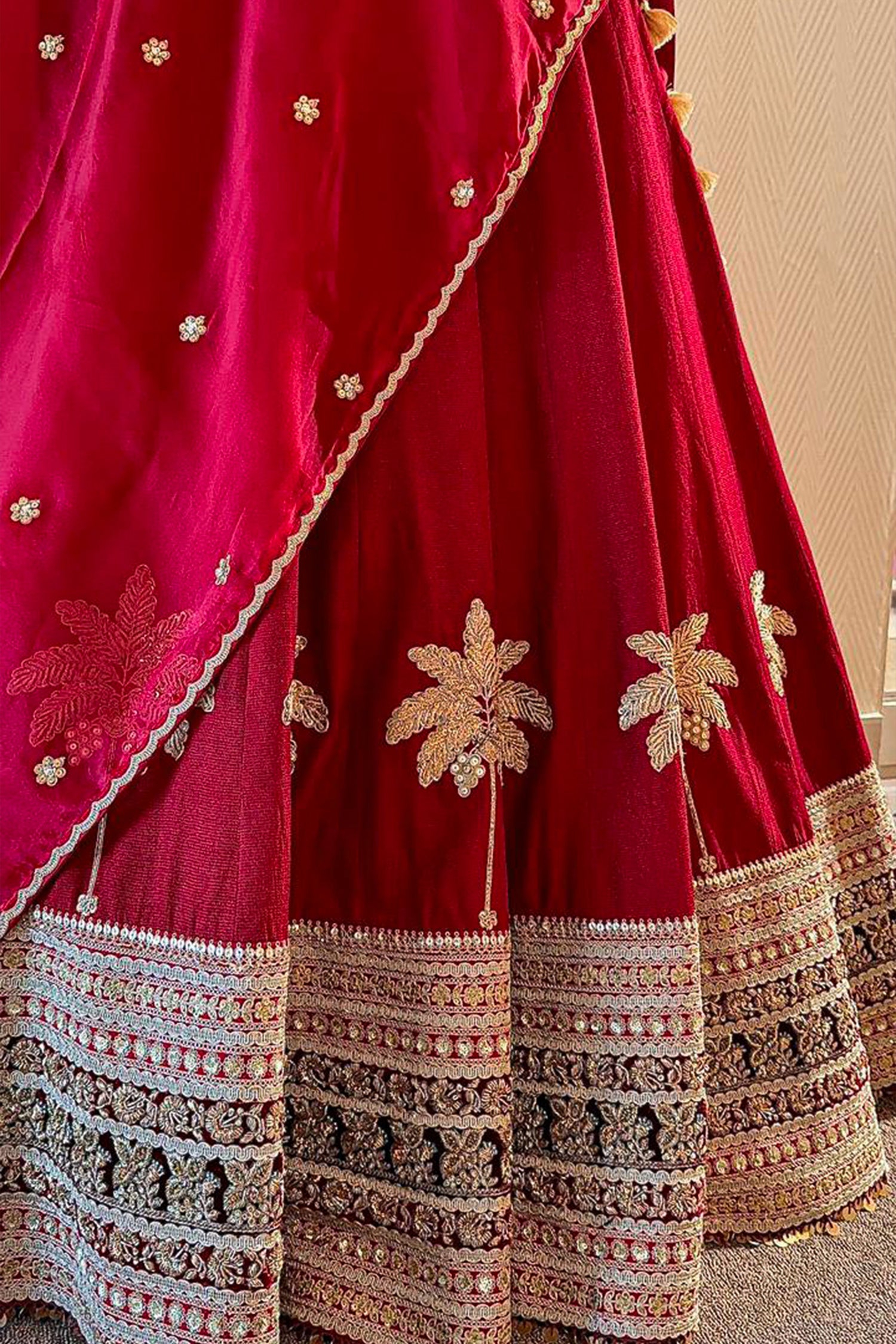 This Maroon Matka Silk Bridal Lehenga is an exemplary piece of craftsmanship designed for the modern bride who treasures heritage. The ensemble is meticulously detailed with a sophisticated combination of traditional Zardosi, shimmering diamonds, and delicate sequins, all woven into an intricate embroidery that spans the heavy border and the unique palm tree motifs on the skirt. Its rich Matka silk fabric provides a regal, structured flare, paired with a matching full-sleeved blouse and a light net dupatta adorned with scattered floral "buttis" for a balanced silhouette. Perfectly suited for a grand wedding ceremony, this designer lehenga embodies a timeless royal aesthetic.