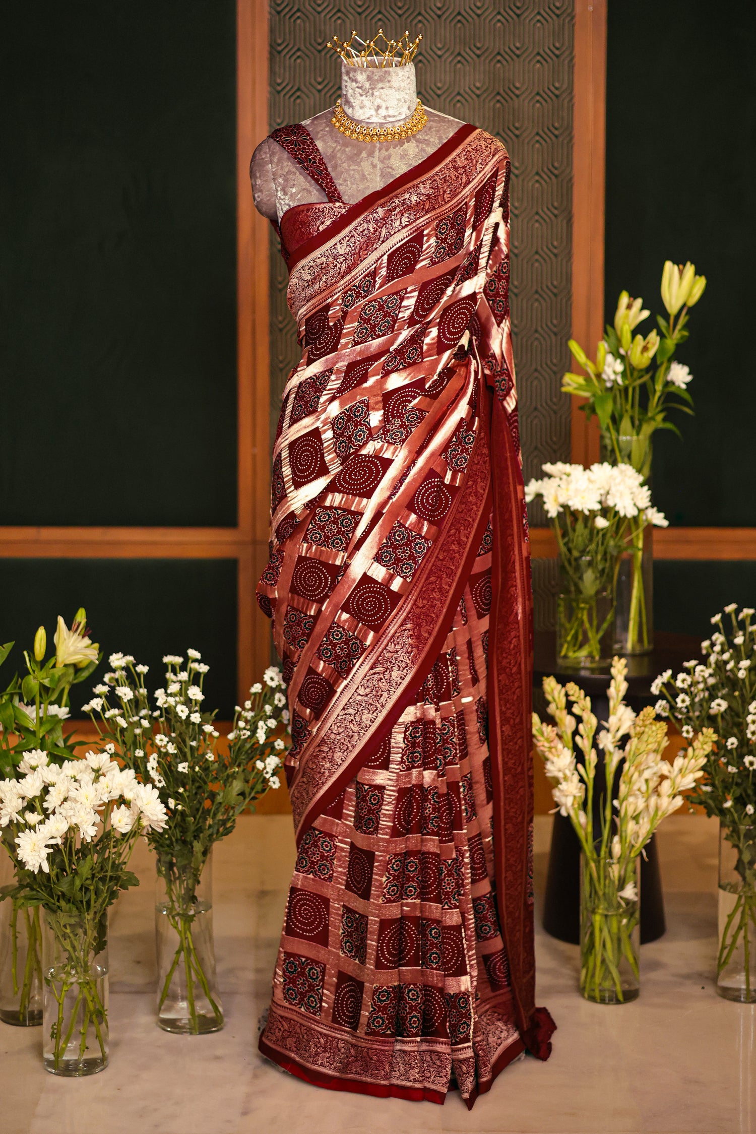 This Maroon Modal Silk Ajrakh Saree showcases classic checks beautifully combined with traditional hand-printed Ajrakh artistry.Its striking border features detailed animal and bird motifs, adding a rich cultural narrative to the drape.The smooth modal silk fabric offers effortless grace while enhancing the intricacy of the design.Complete with an unstitched blouse piece, this ensemble exudes unmatched luxury and refined elegance.