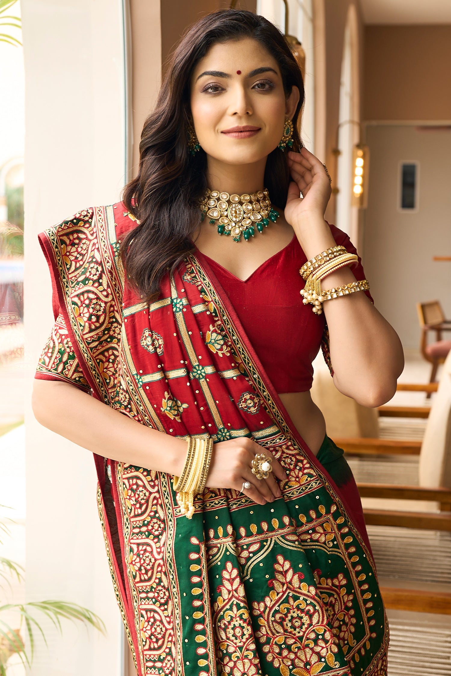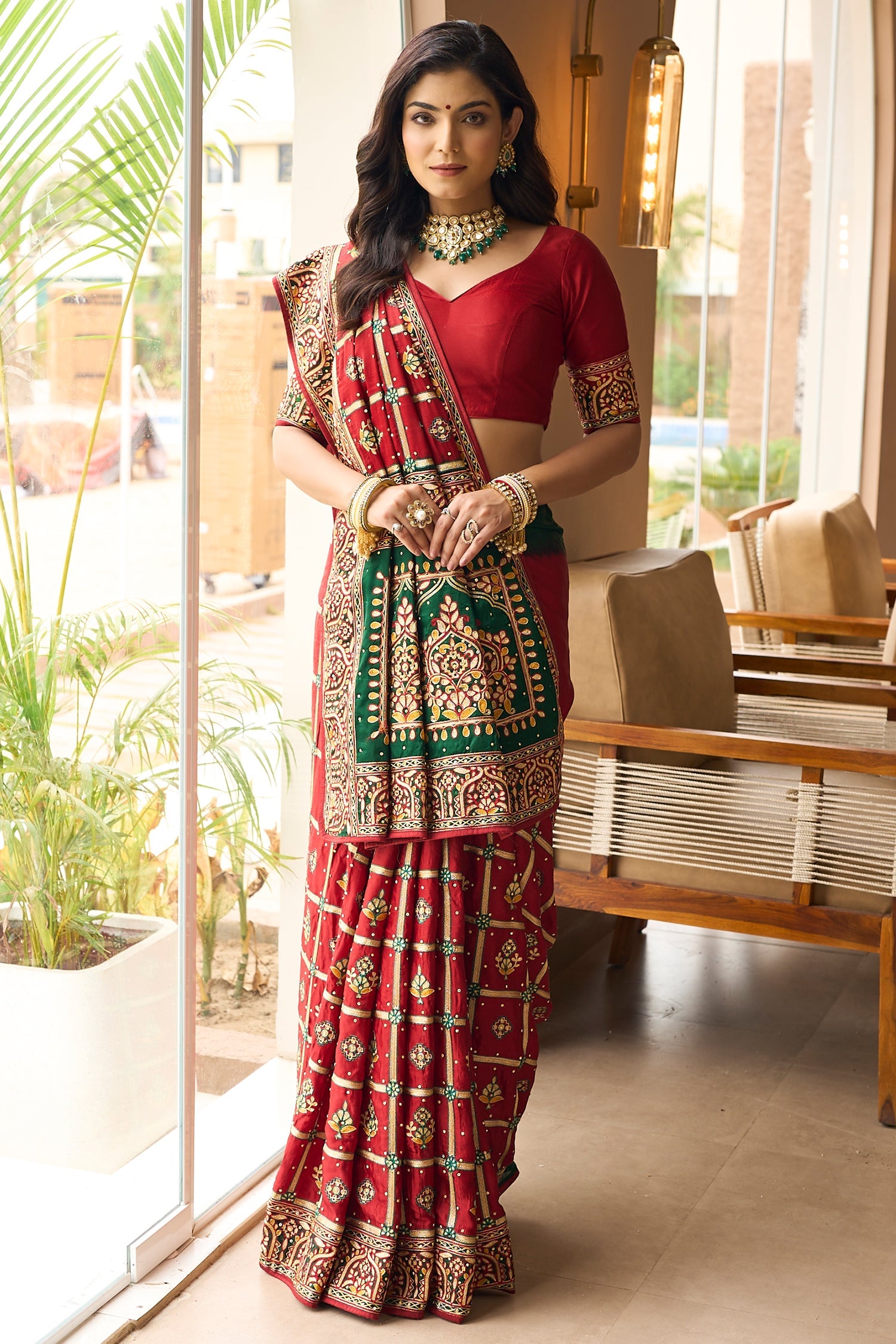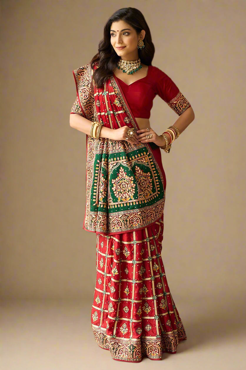 Embrace heritage elegance with our Maroon Semi‑Silk Checks Gharchola Saree with Embroidery—a luxurious take on the timeless Gharchola tradition, crafted for festive rituals, poojas, and bridal celebrations.