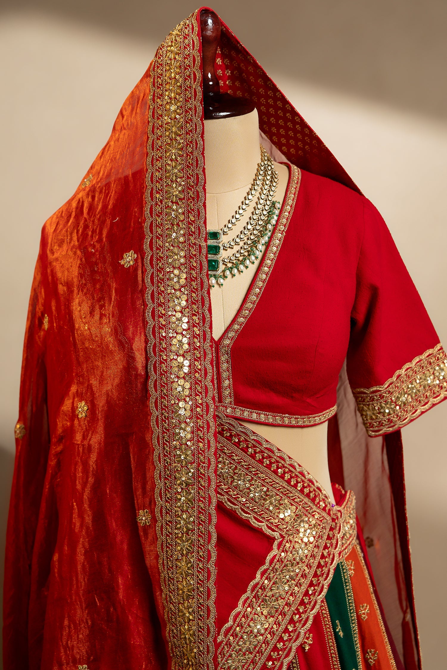 This breathtaking bridal lehenga features rich matka silk panels in vibrant jewel tones, adorned with intricate gota and zardosi handwork. The deep red blouse adds a bold traditional charm with its finely embellished borders. Paired with a luxurious velvet-finish dupatta and a second light zari dupatta, it creates a truly regal layered look. The ornate hemline adds grandeur, making it a stunning choice for a heritage bridal ensemble.