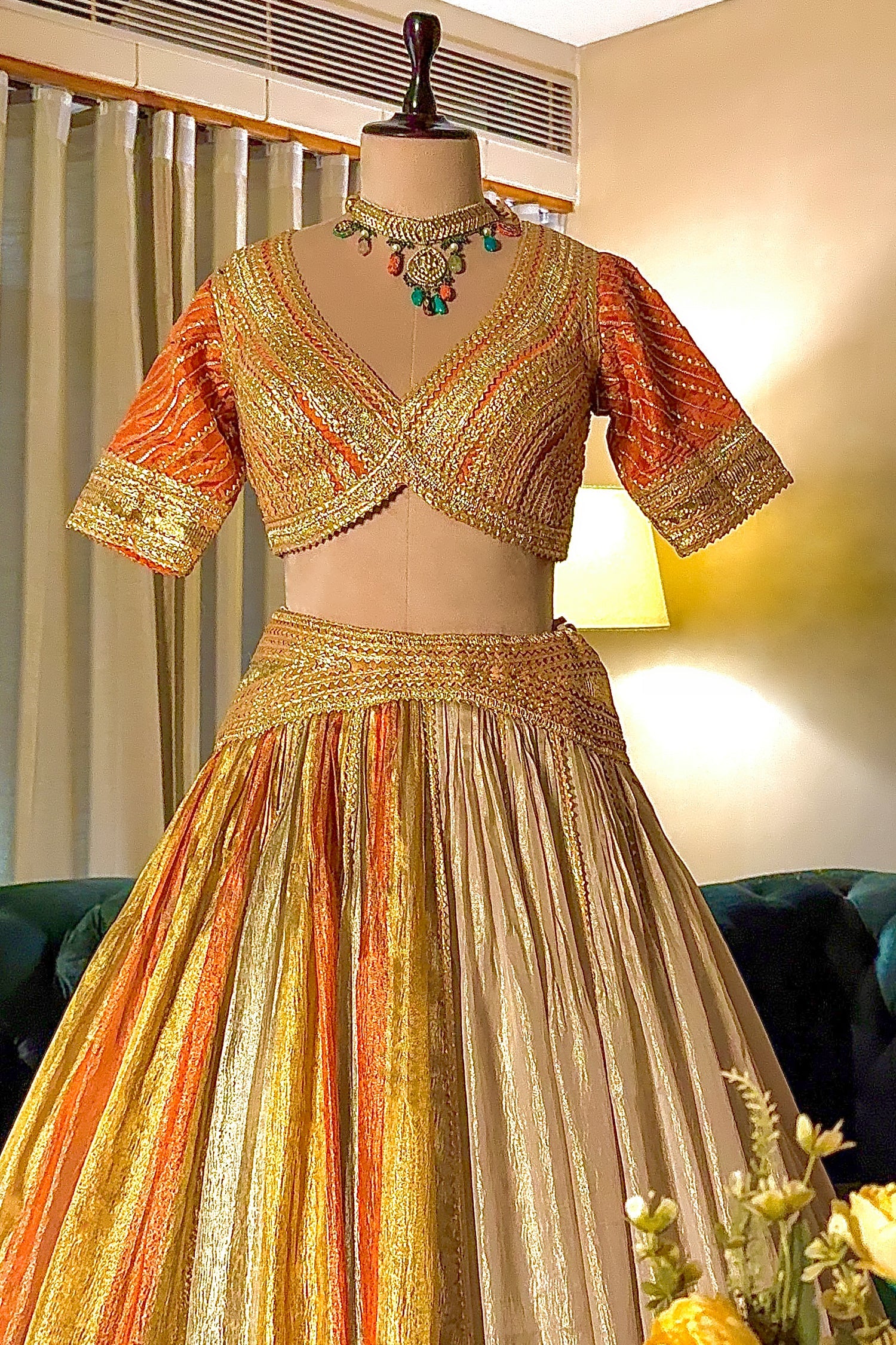 A: The dupatta is a mix of tissue and organza, giving it a rich metallic sheen that complements the orange tones.