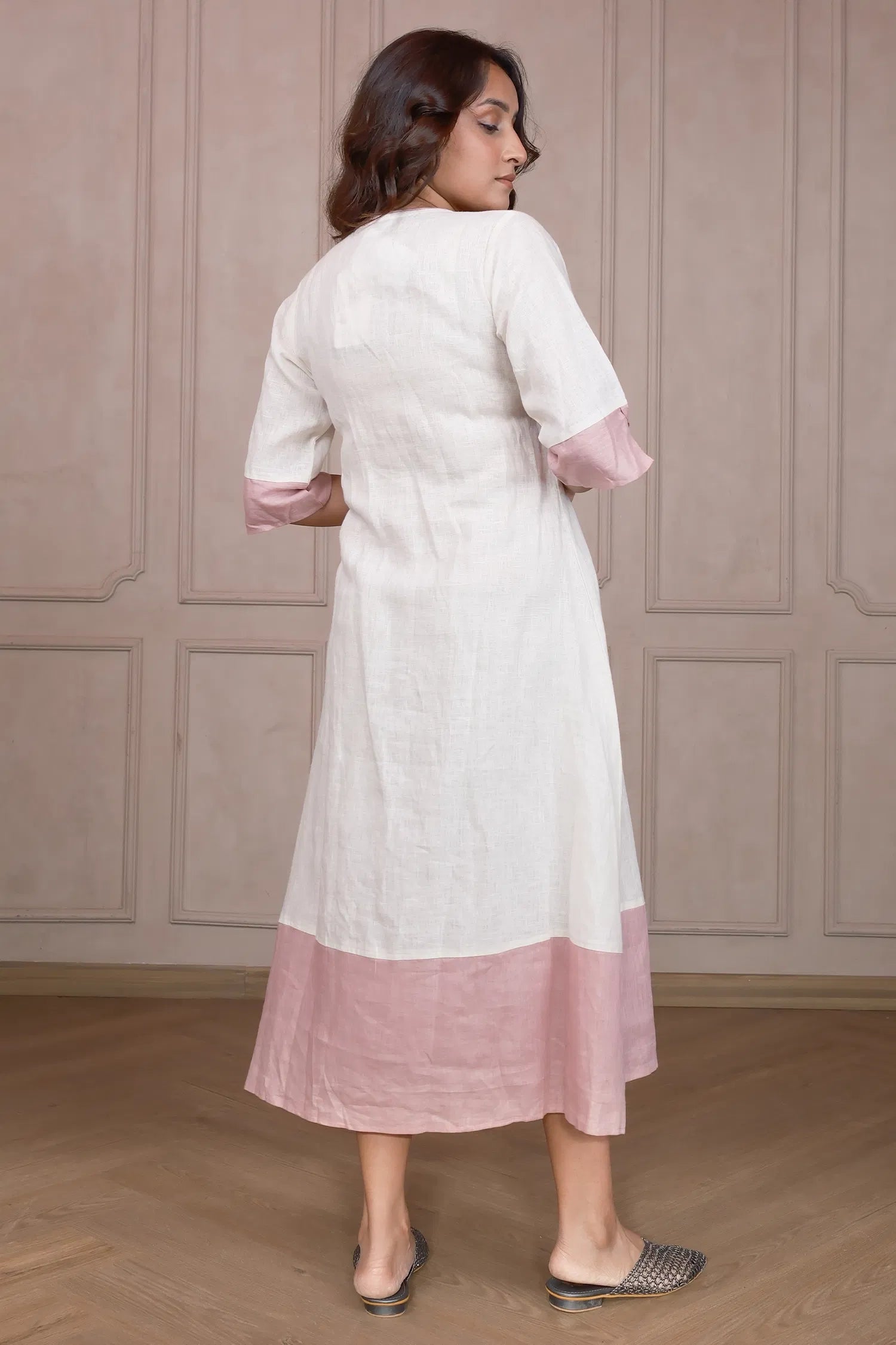 Finished with blush pink detailing on the cuffs and hem, this kurti brings subtle color play that stands out without being loud.