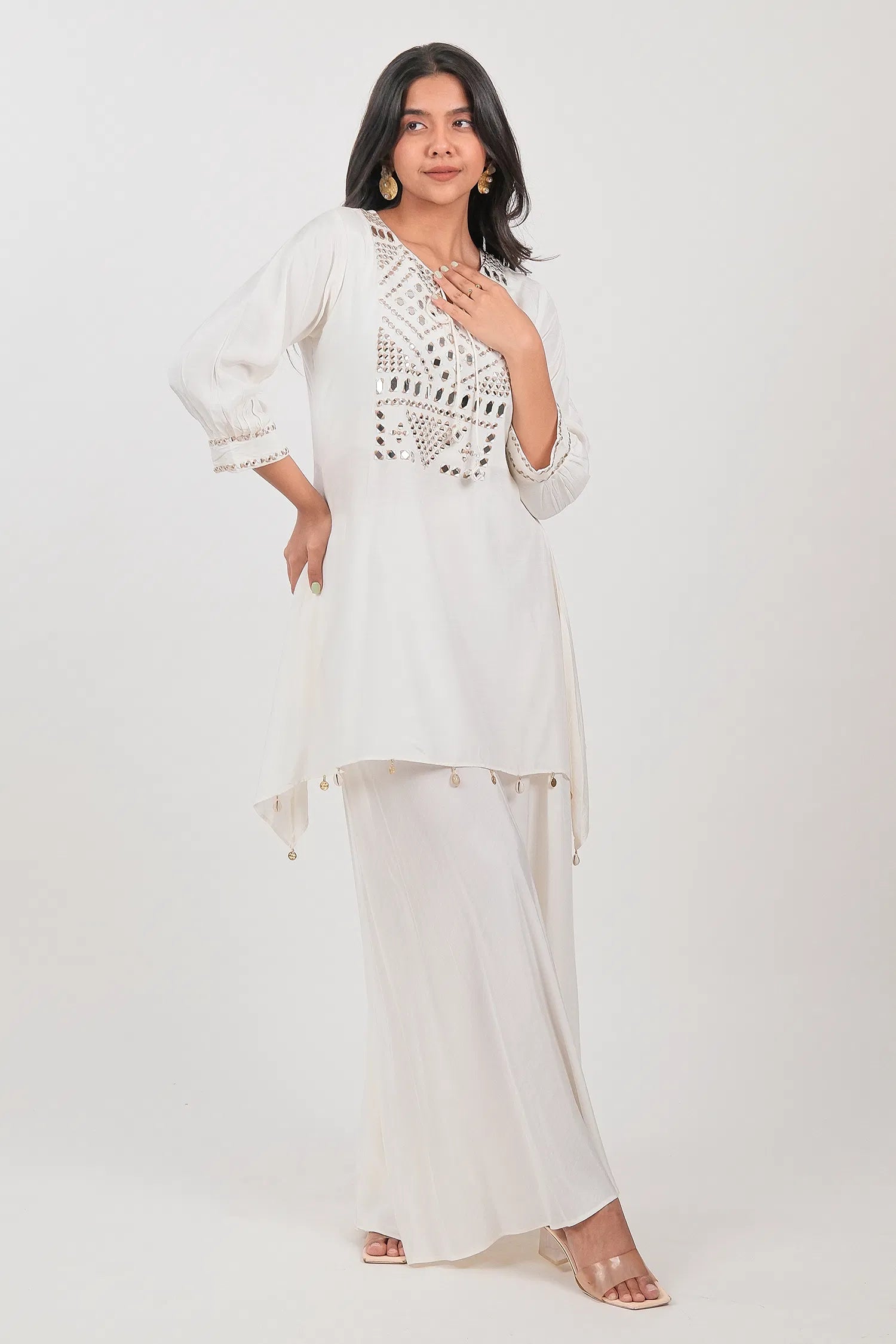 Delicate mirror motifs intricately adorn the kurti and palazzo hem, bringing a radiant shimmer that feels festive yet refined.