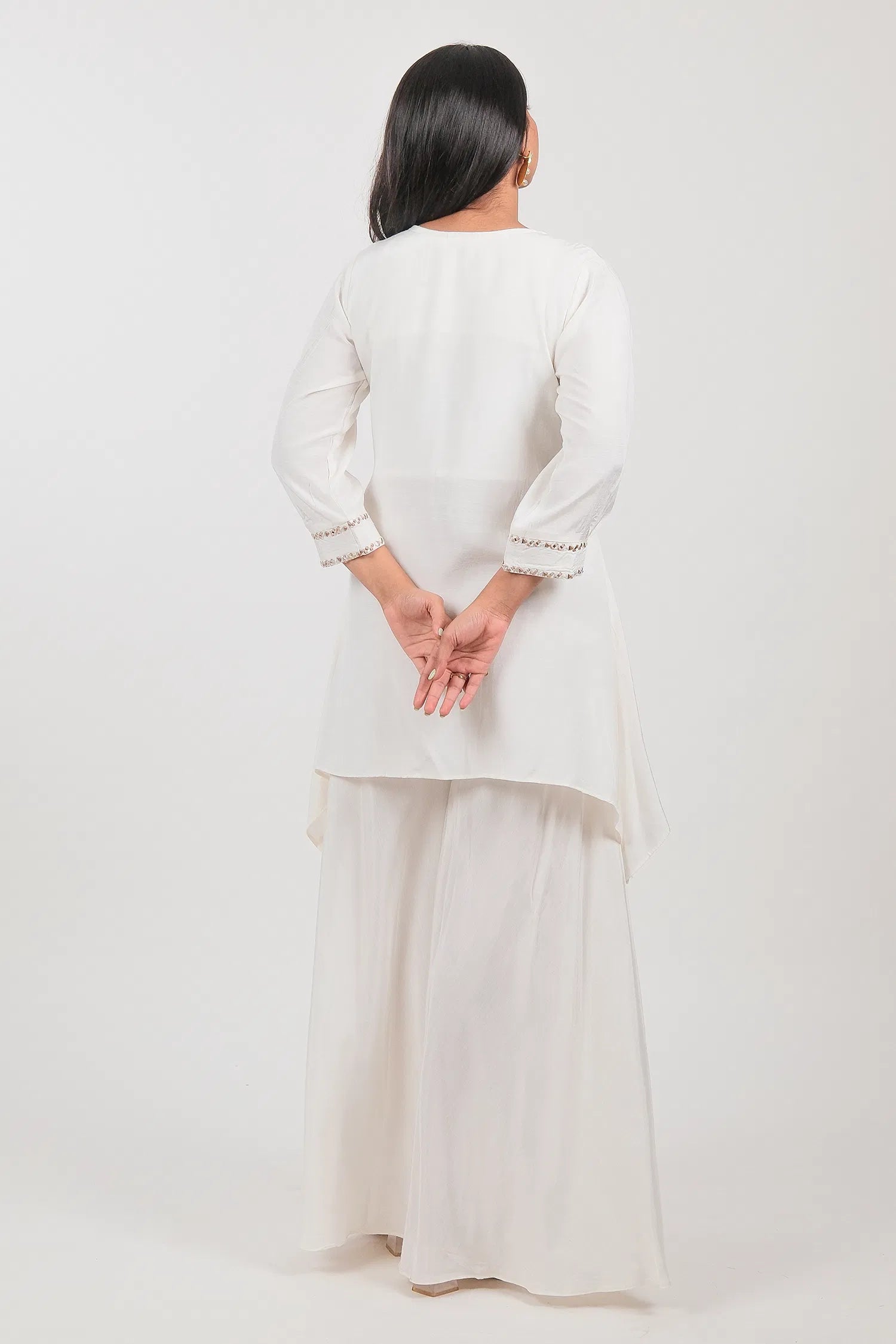Illuminate your wardrobe with our Off‑White Silk Mirror‑Embroidered Kurti & Palazzo Set, where shimmering mirrorwork meets relaxed tailoring. Designed for those who appreciate quiet elegance with a hint of sparkle—perfect for festive gatherings or elevated daywear.