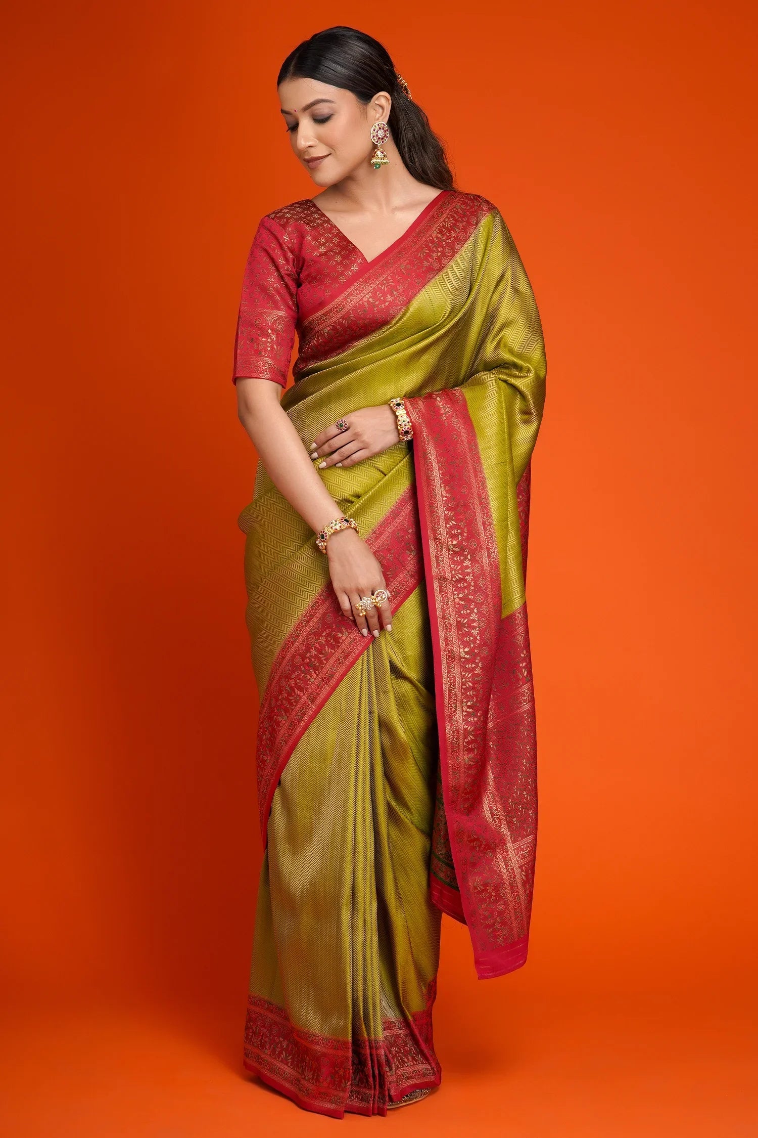 Step into refined tradition with our Olive Green Art Silk Saree—an elegant drape featuring all-over woven motifs and a muted earthy palette. Ideal for festive mornings, pujas, or formal gatherings where subtlety speaks volumes.