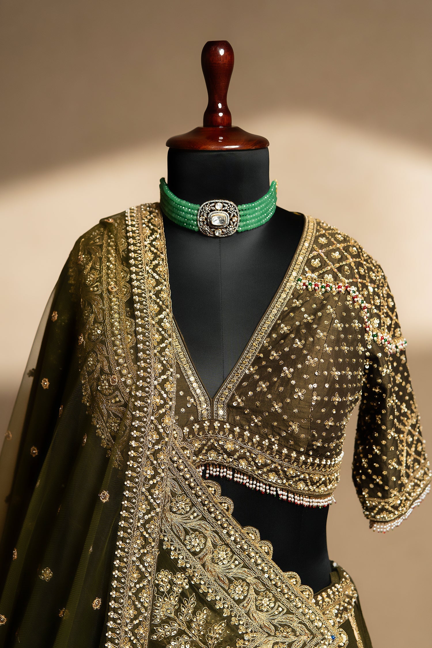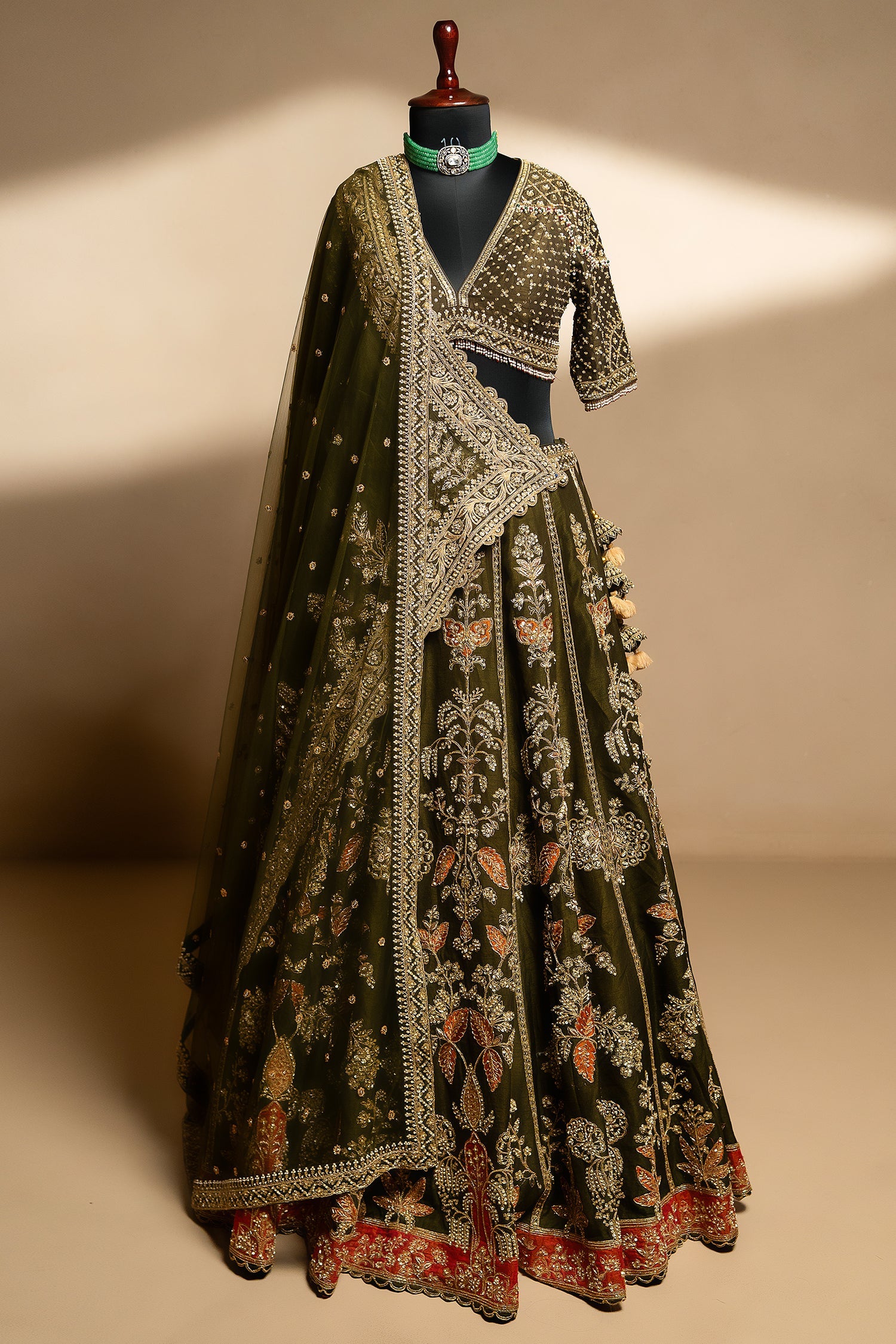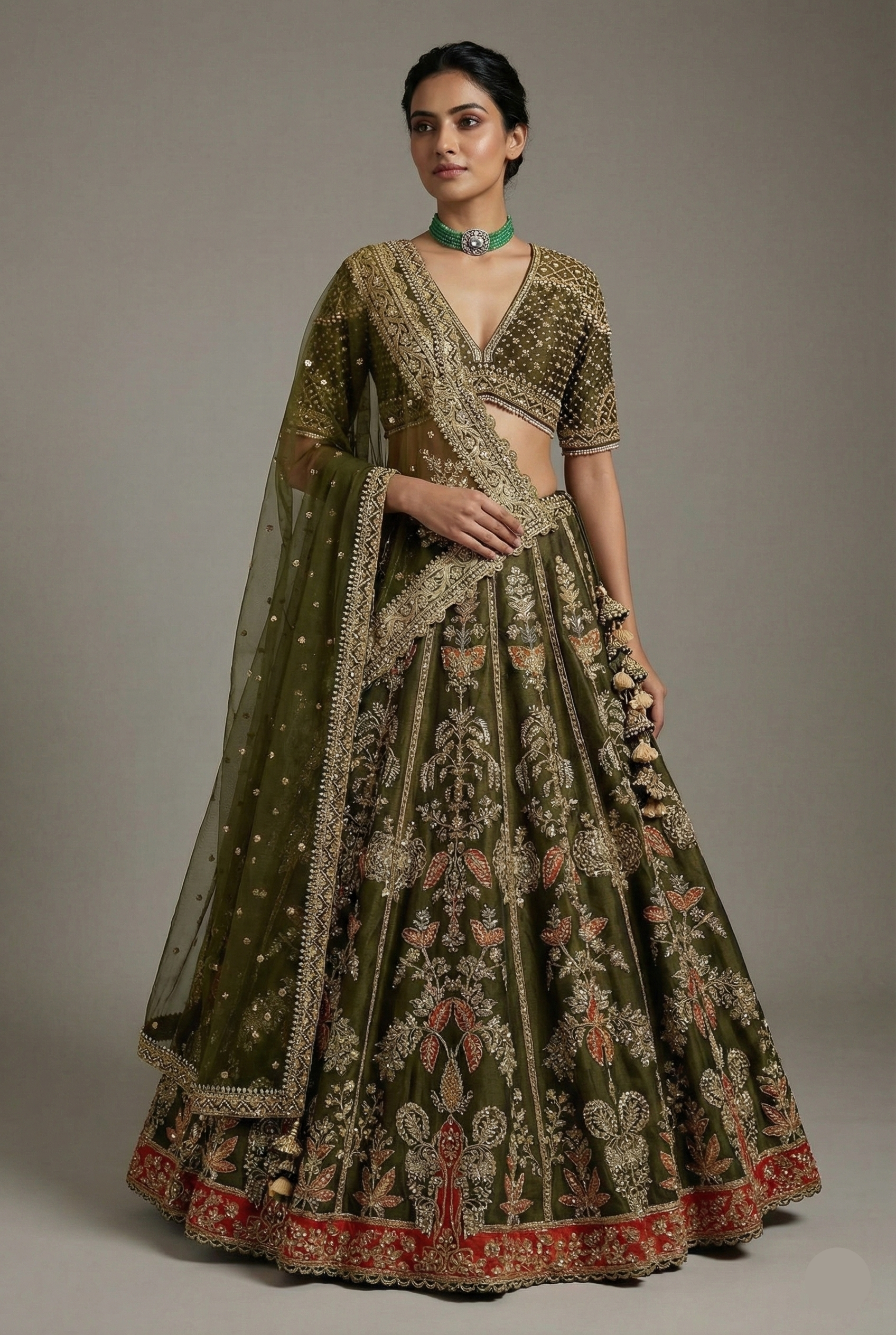 This olive green bridal lehenga dazzles with rich zardosi, sequins and intricate hand-embroidered detailing that creates a regal, heritage-inspired look. The deep V-neck blouse is adorned with fine embellishments and delicate bead edging for added grace. Its double-dupatta style , one intricately bordered and one lightly embellished—adds grandeur and versatility. Perfect for weddings and royal celebrations, this ensemble promises a timeless and luxurious statement.