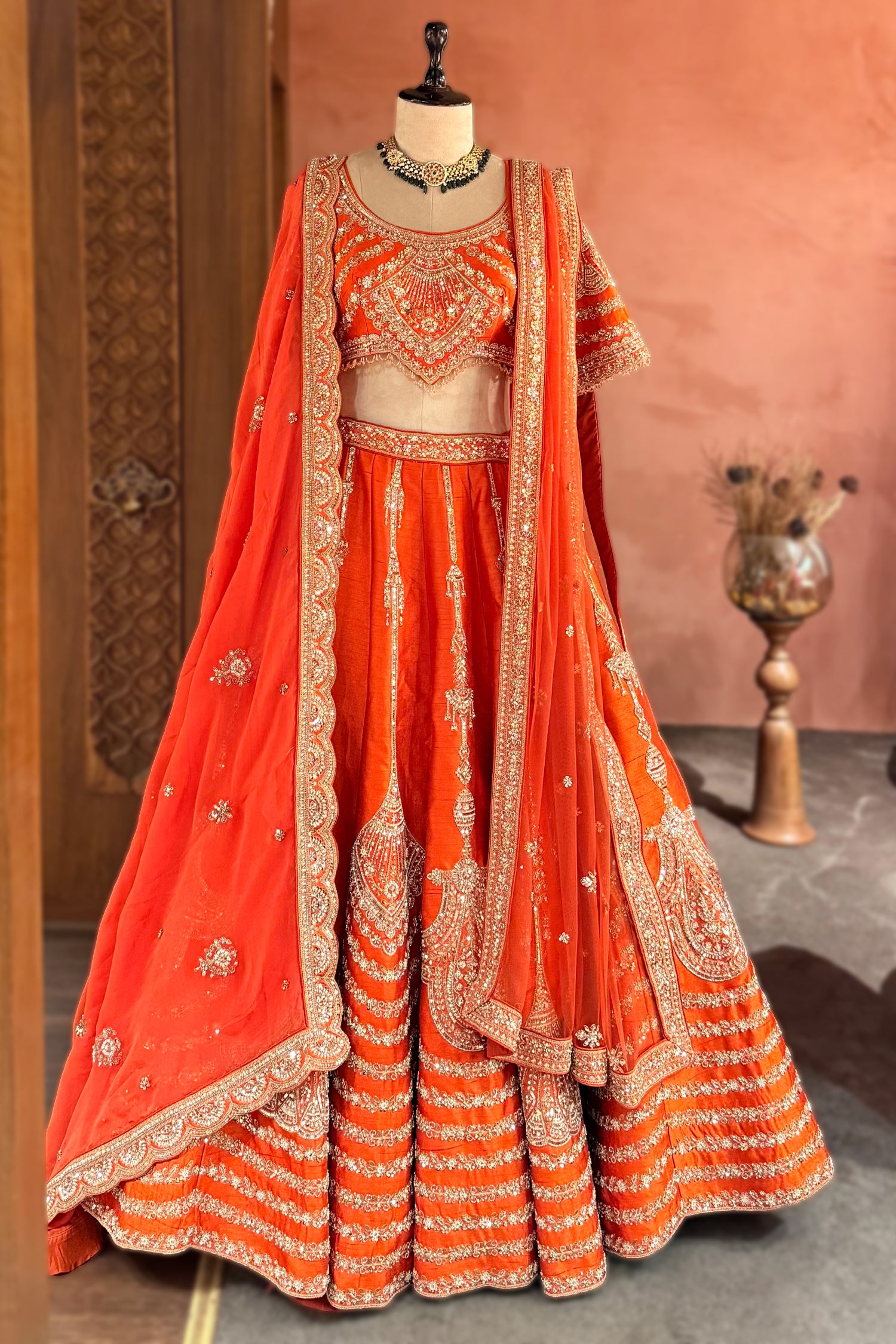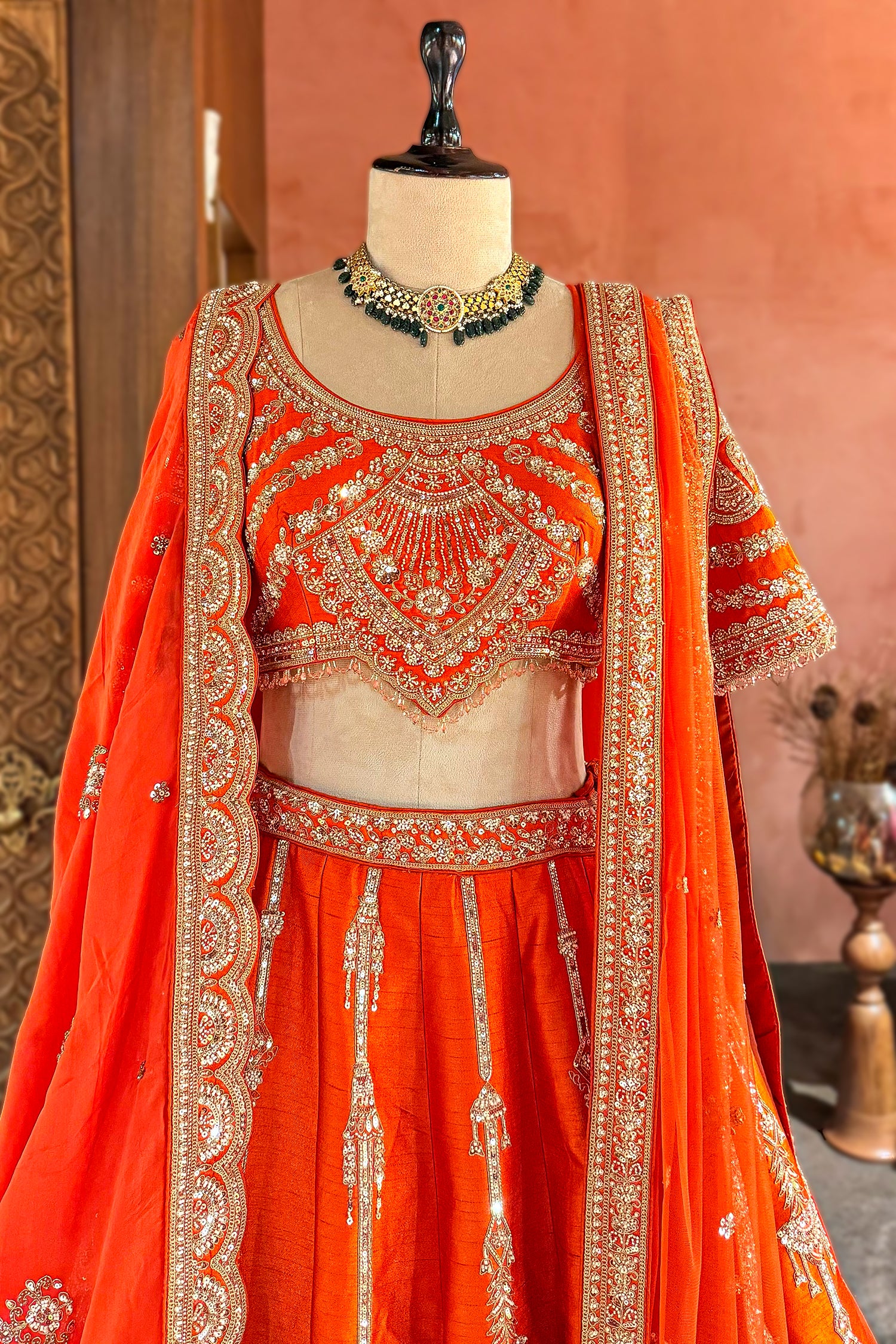 This Burnt Orange Raw Silk Lehenga is a masterclass in "Sunset-Chrome" luxury, specifically engineered to radiate a warm, lit-from-within glow that illuminates the skin. The architectural silhouette is defined by Vertical Chandelier linear embroidery, where hand-stitched Sequins, Cutdana, and Beads act as light-reflecting tracks to create a height-elongating illusion for the 2026 bride. The lehenga’s weighted base features a majestic Scalloped-Arch border, providing the necessary "Hem-Gravity" for a structured, royal sweep during every cinematic entrance.The ensemble is elevated by a designer blouse featuring a Deep U-Neckline, meticulously cut to act as a "Negative Space" canvas for heavy heritage Polki or Emerald chokers. The signature Scalloped Hemline of the blouse, finished with delicate beaded fringes, creates a rhythmic, wave-like transition to the waist, ensuring a "snatched" and modern hourglass fit. Completing this high-fashion masterpiece is the Double-Dupatta luxury: a structured Silk-Organza veil that maintains its crown-like volume over the head, paired with a fluid Net dupatta for an ethereal, sheer shoulder drape that keeps the look airy yet grand.