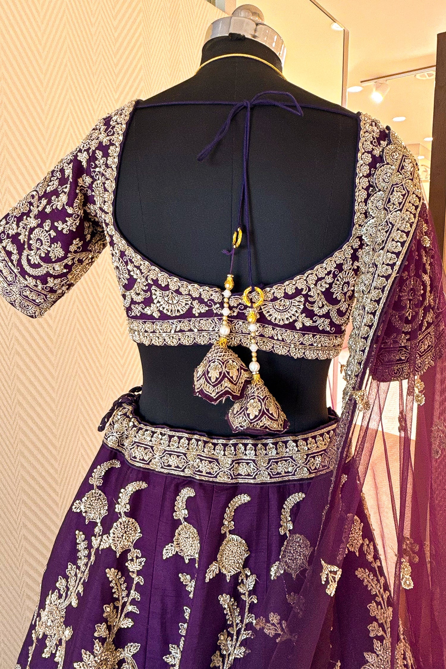 A: Raw silk provides a majestic structure and "khada" (upright) look to the flare; while it feels substantial, it is breathable and comfortable for weddings lasting 6-8 hours.