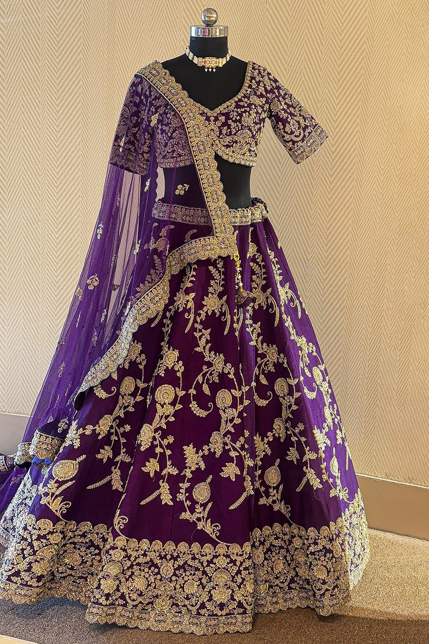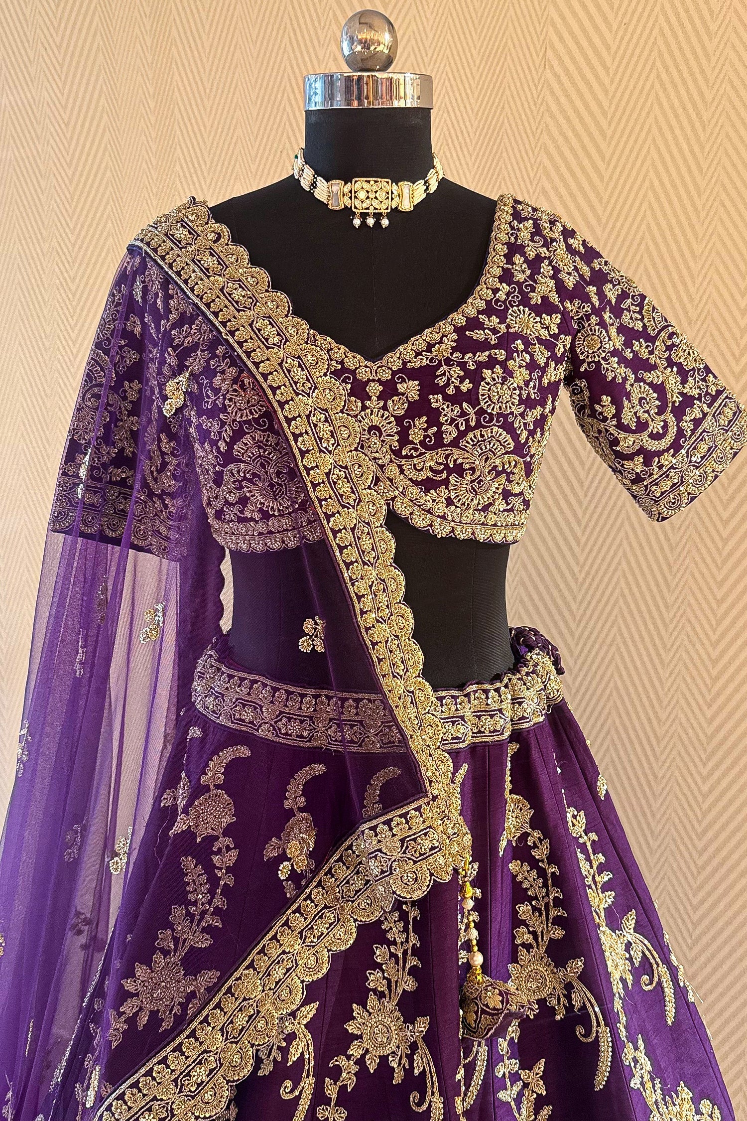 This Palatinate Purple Raw Silk Lehenga is a royal masterpiece, featuring an exquisite all-over floral jaal pattern crafted with traditional zardosi and shimmering sequins. The ensemble is designed with a heavy raw silk base that offers a rich, structured flare, complemented by a meticulously embroidered blouse with elbow-length sleeves and a classic U-neckline. Intricate beadwork and fine thread embroidery adorn the entire skirt, leading down to a magnificent broad border that adds a sense of grandiosity to the silhouette. Paired with a soft tulle dupatta featuring a matching scalloped border, this lehenga is a perfect choice for bridal wear or elite wedding receptions. The deep purple hue combined with antique gold work creates a timeless aesthetic that ensures you look like royalty on your special day.