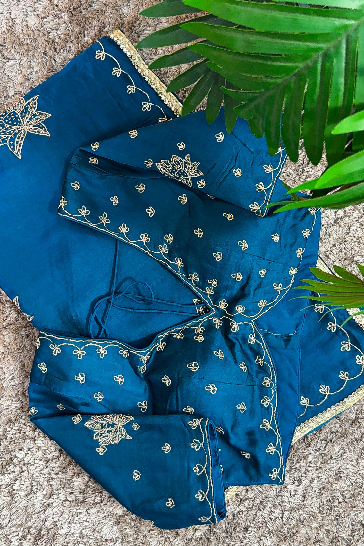Enhance the rich peacock blue tones with contrasting gold or champagne-toned jewelry. A sleek, side-swept hairstyle will perfectly showcase the intricate mirror-work on the blouse's V-neckline and scalloped hem. Finish with a bold eyeliner and a nude lip for a striking, balanced aesthetic.