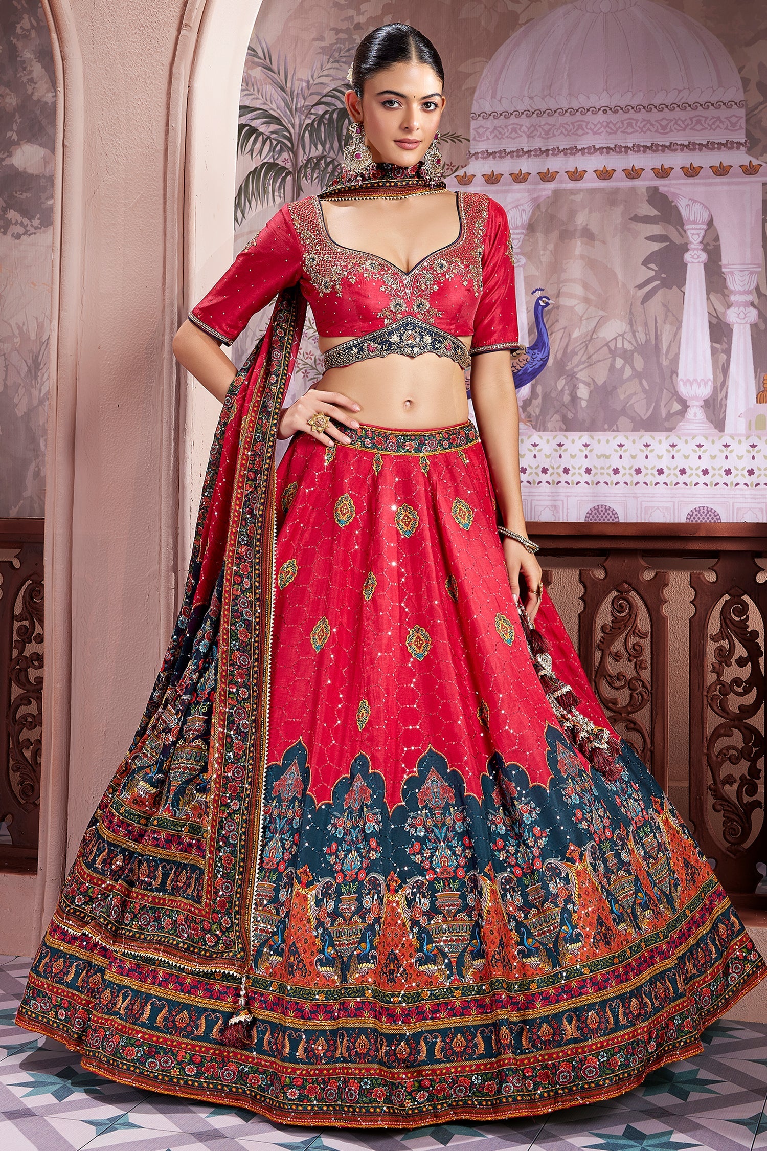Step into a floral paradise with this Pink Chiffon Silk Lehenga, designed for effortless elegance and fluid movement. The lehenga features a vibrant all-over digital floral print interspersed with majestic peacock motifs, celebrating the beauty of nature in every fold. The delicate fabric is subtly highlighted with shimmering sequin work, which adds a gentle sparkle that catches the light beautifully without overpowering the intricate prints.The ensemble is paired with a striking matching blouse, featuring a modern sweetheart neckline that offers a sharp, feminine silhouette. The blouse is a masterpiece of detail, intricately hand-adorned with shimmering sequins and fine embroidery that elevate the digital prints. A coordinated sheer dupatta with a matching printed border and delicate accents completes this enchanting look. Ideal for sangeet ceremonies, garden weddings, or festive celebrations, this lehenga is a perfect blend of contemporary style and traditional charm.