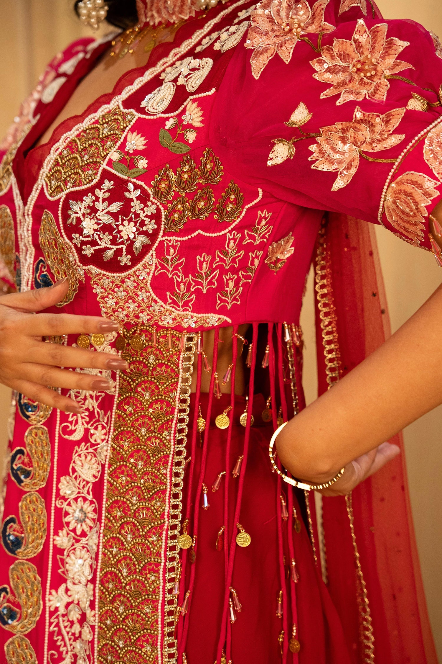 Q: How does the red dupatta enhance the overall pink outfit? A: The contrasting red net dupatta adds depth and drama, making the look more festive and striking. It beautifully highlights the embroidery and creates a bold wedding-ready color combination.