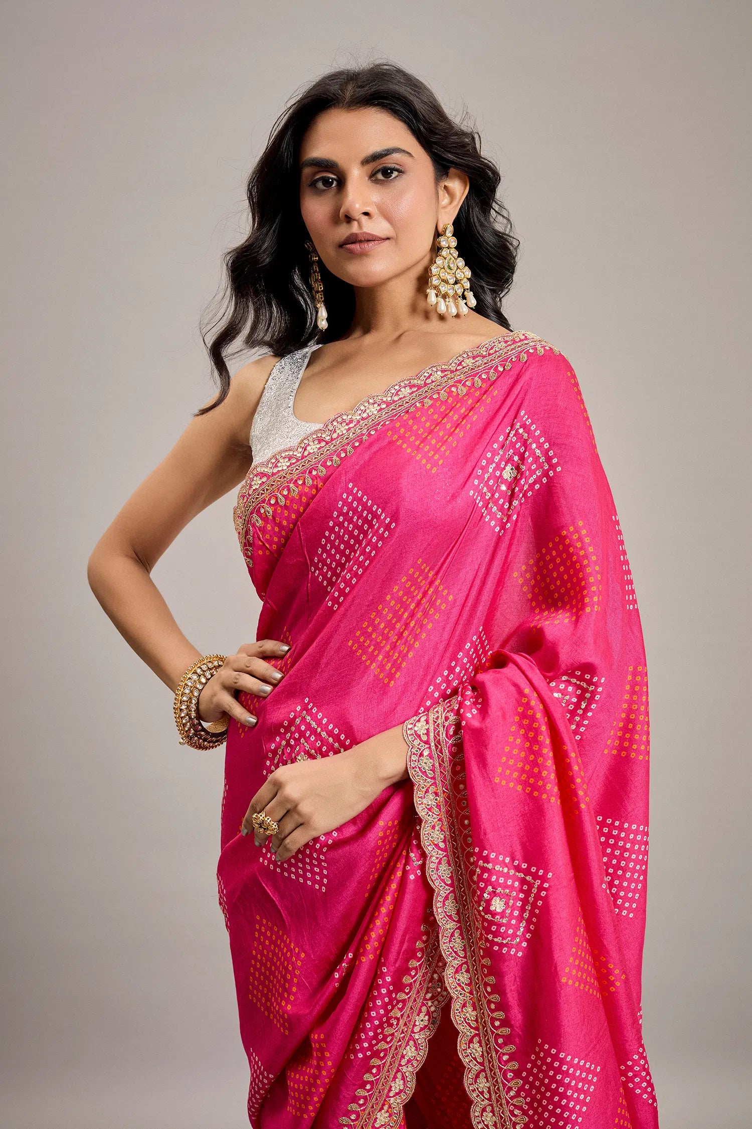 Featuring iconic bandhani prints across the body, the saree is framed with a delicately scalloped border, embellished with sequins for a touch of modern glamour.