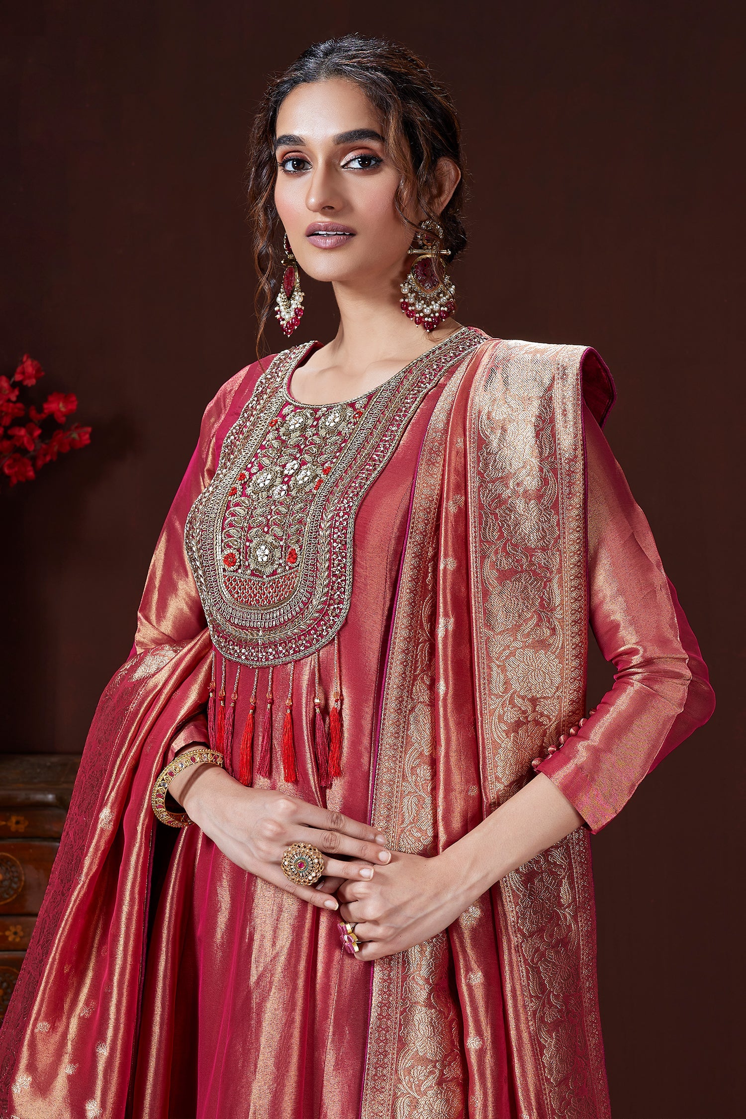 Capture the spotlight in this pink tissue silk Anarkali Palazzo suit, designed to radiate refined glamour. The Anarkali features a rich metallic luster, complemented by a heavily encrusted neckline adorned with intricate Zardosi, beadwork, and sequin embroidery, flowing seamlessly into elegant tassel detailing. Paired with coordinated palazzo pants and a matching woven zari tissue dupatta, the ensemble offers voluminous yet lightweight movement. This design beautifully balances traditional opulence with a modern, statement-making silhouetteâperfect for grand celebrations.