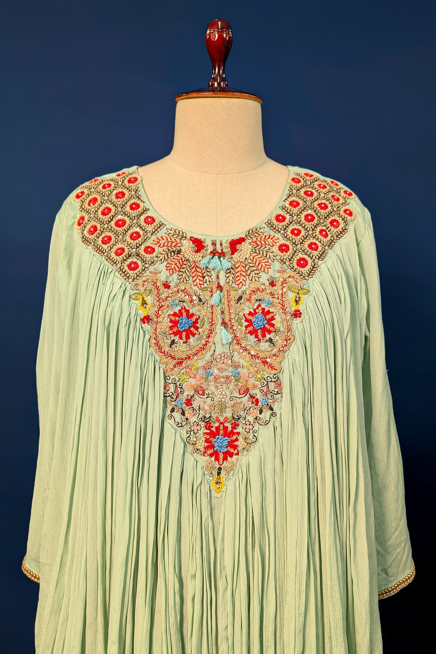 This elegant Pista Green Co-Ord Set is crafted from premium Chinon Georgette, offering a graceful drape and a lightweight, airy feel. The short tunic features intricate hand-embroidery and sequin work along the neckline, adding a vibrant pop of color and traditional charm. Its pleated silhouette creates a flattering flow, perfectly complemented by the matching tiered sharara bottoms for a cohesive look. Designed for both comfort and style, this ensemble is an ideal choice for festive gatherings, mehendi ceremonies, or semi-formal events. The soft pastel hue and shimmering accents make it a sophisticated addition to any modern ethnic wardrobe.