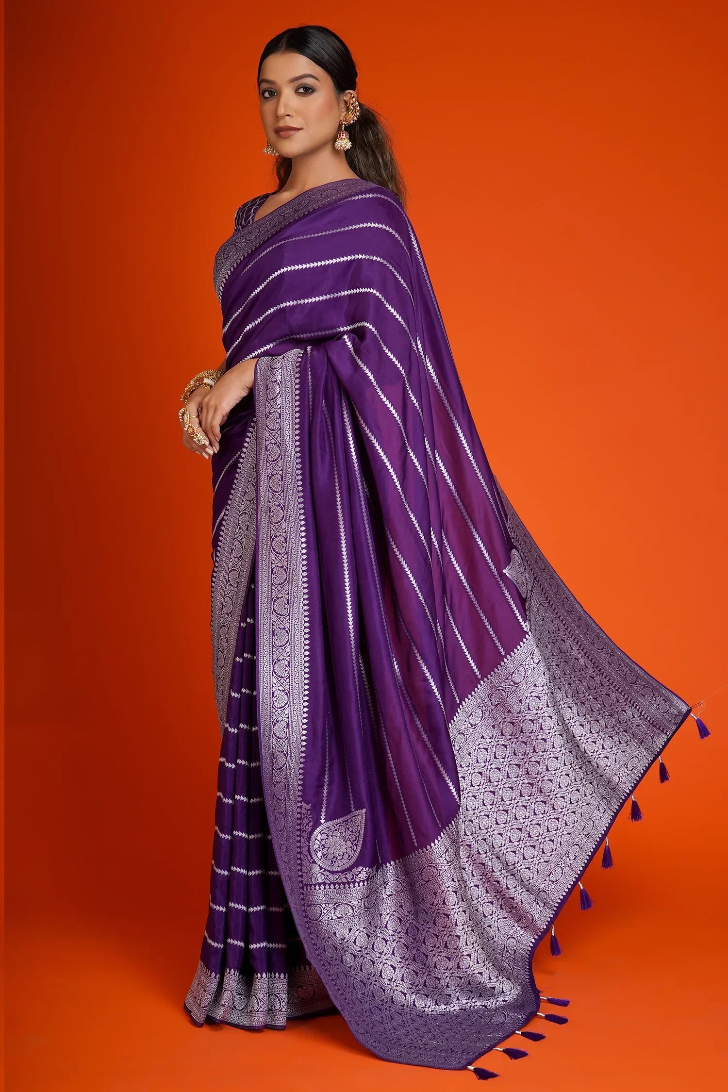 Detailed with intricately woven floral patterns along the border and pallu, the design brings a refreshing softness to the deep purple base—balancing opulence with delicacy.