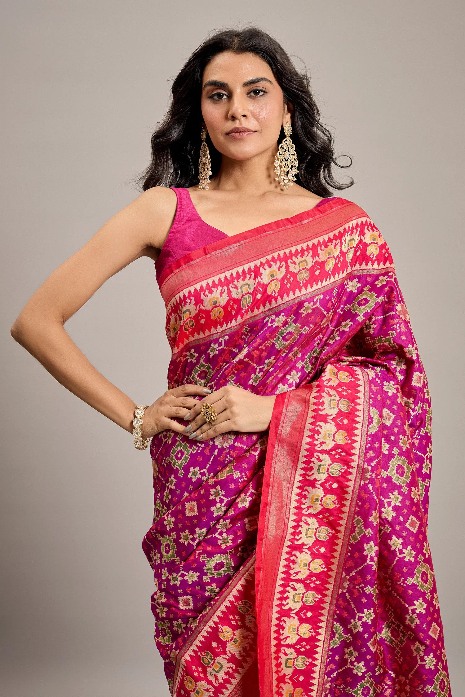 Adorned with intricate patola-inspired designs, the saree features bold geometric patterns and folk elements—echoing centuries of vibrant handloom heritage in every thread.
