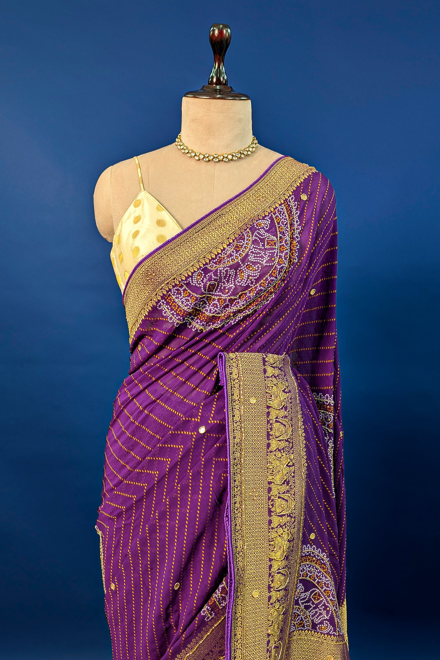 Make a regal statement in this Purple Georgette Printed Saree, designed with a lightweight and fluid drape for ultimate comfort. The saree features delicate leheriya-style printed stripes and is elevated by a rich woven golden border and a heavily detailed cutdana worked pallu. Intricate circular motifs and floral embroidery add a touch of traditional artistry to the vibrant purple hue, creating a look of timeless grace. Complete with an unstitched blouse piece, this ensemble exudes unmatched luxury and refined elegance.