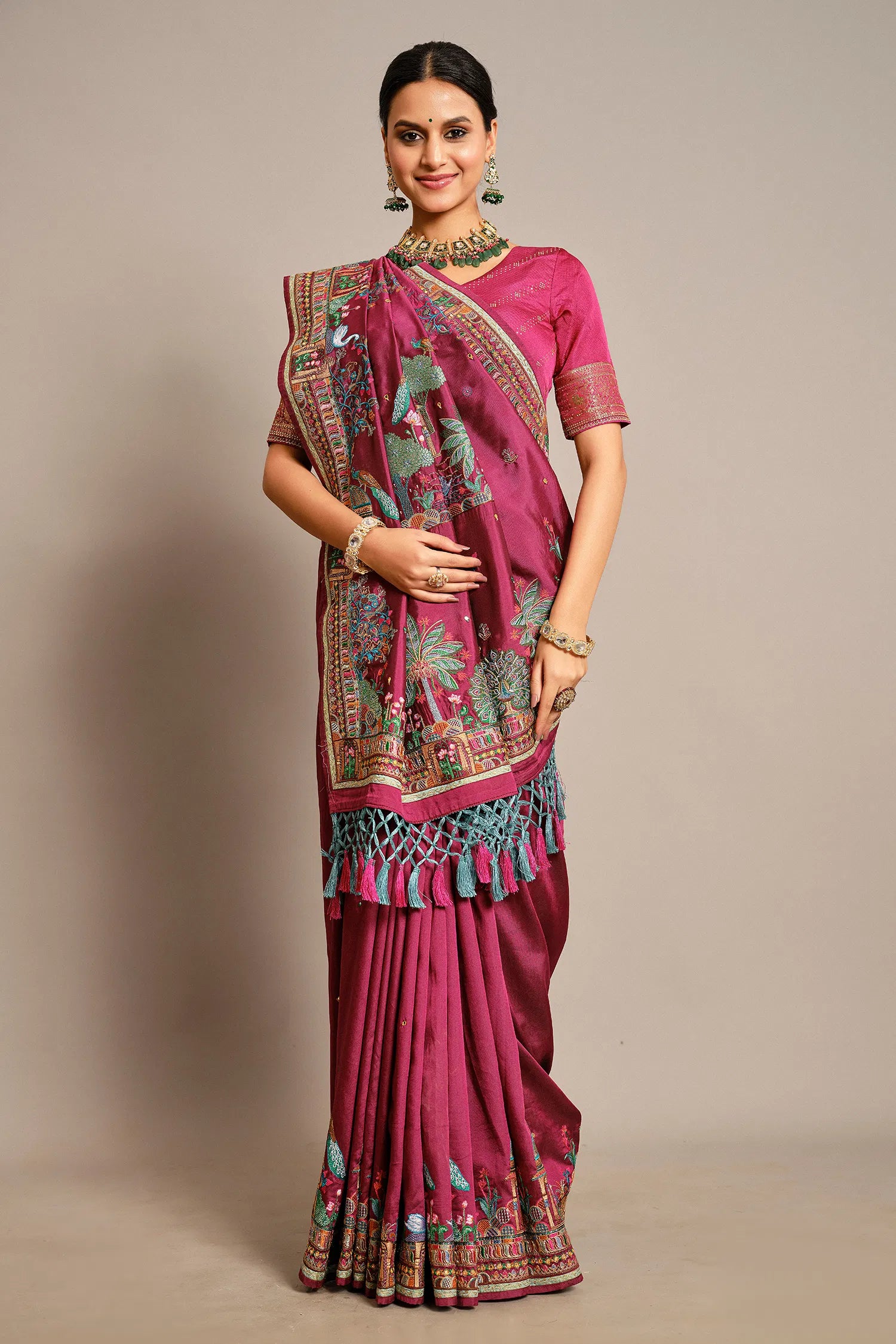 Step into sophistication with our Purple Satin Silk Saree, a captivating piece adorned with intricate embroidery and shimmering cutdana work. Perfect for evening receptions, festive celebrations, or special occasions that call for graceful allure.