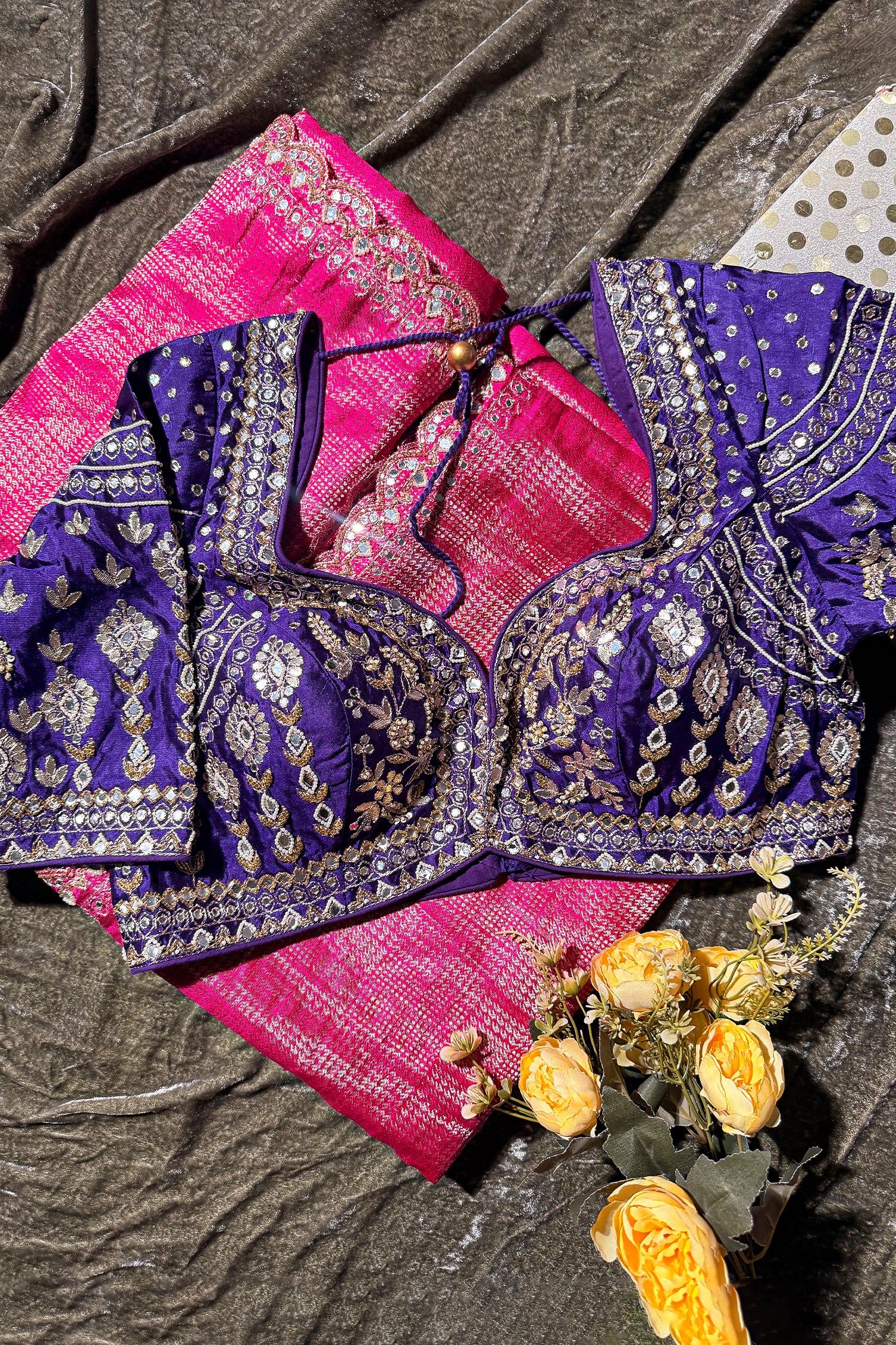A: That’s the best part! The contrast mirror-work blouse is so versatile; you can pair it with a plain gold tissue saree or a simple white chiffon for a completely different look.